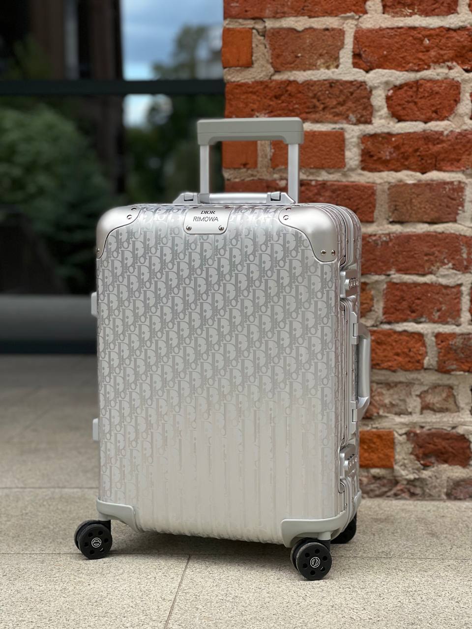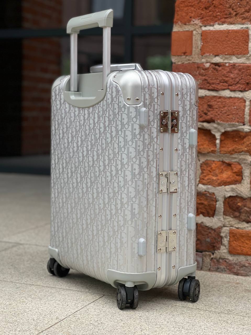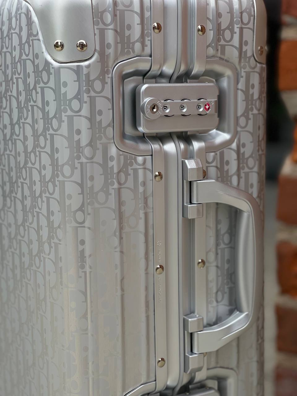Серебристый алюминиевый чемодан — олицетворение современного люкса и сдержанного минимализма. Вертикальные рёбра, тонкая монограмма и окованные металлические углы создают изящный, продуманный дизайн.