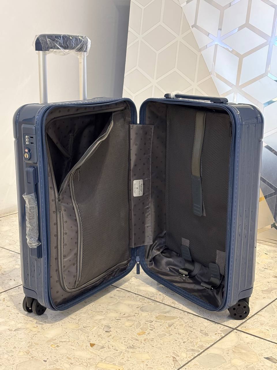 Компактный чемодан, материал — пластик, с классическим рифлёным дизайном и тёмно-синим оттенком.