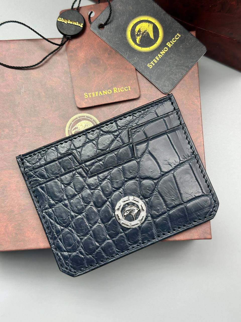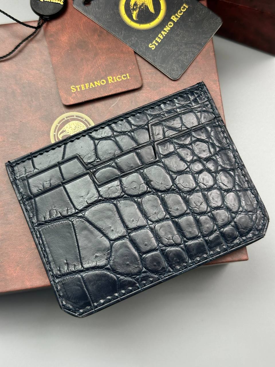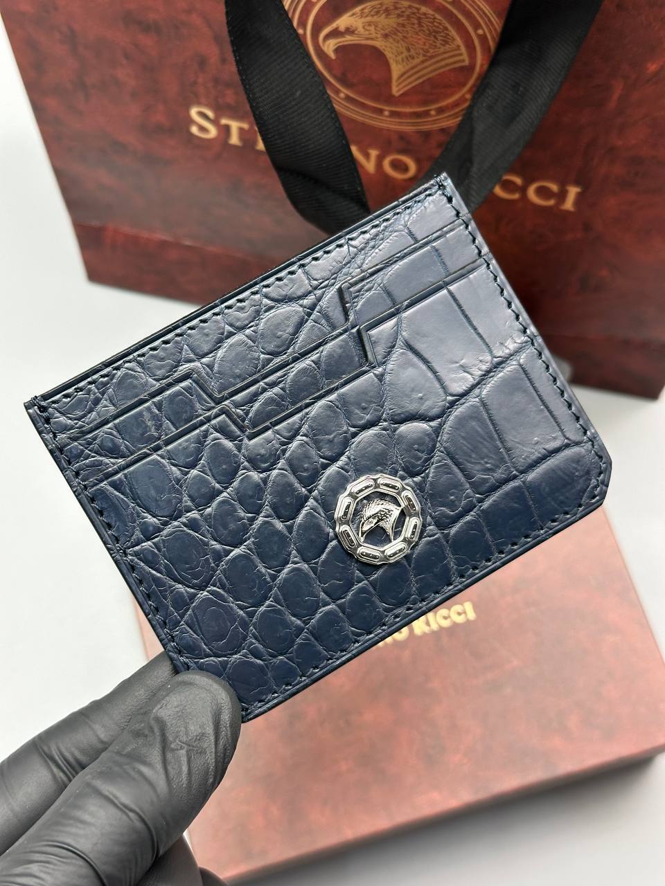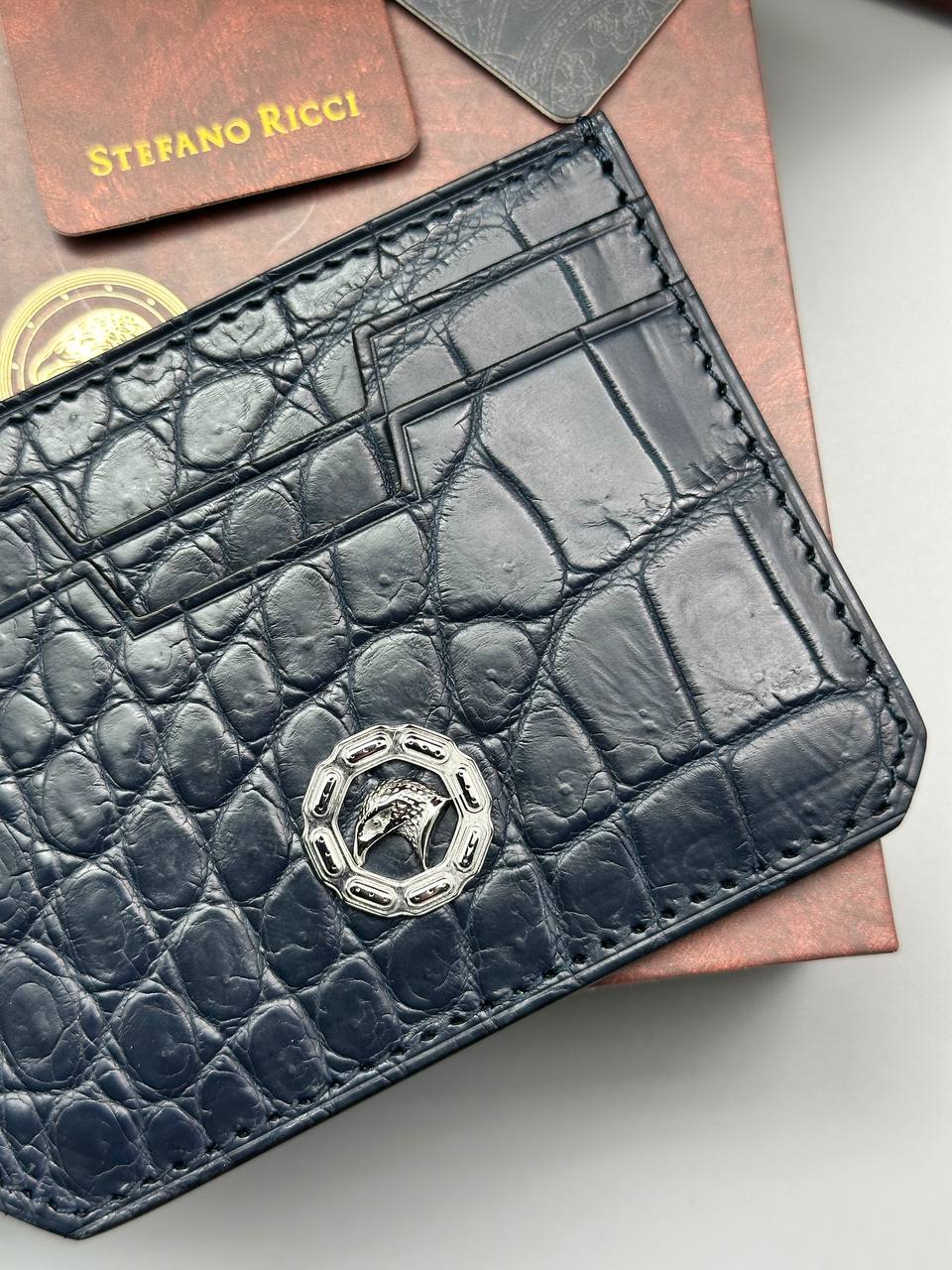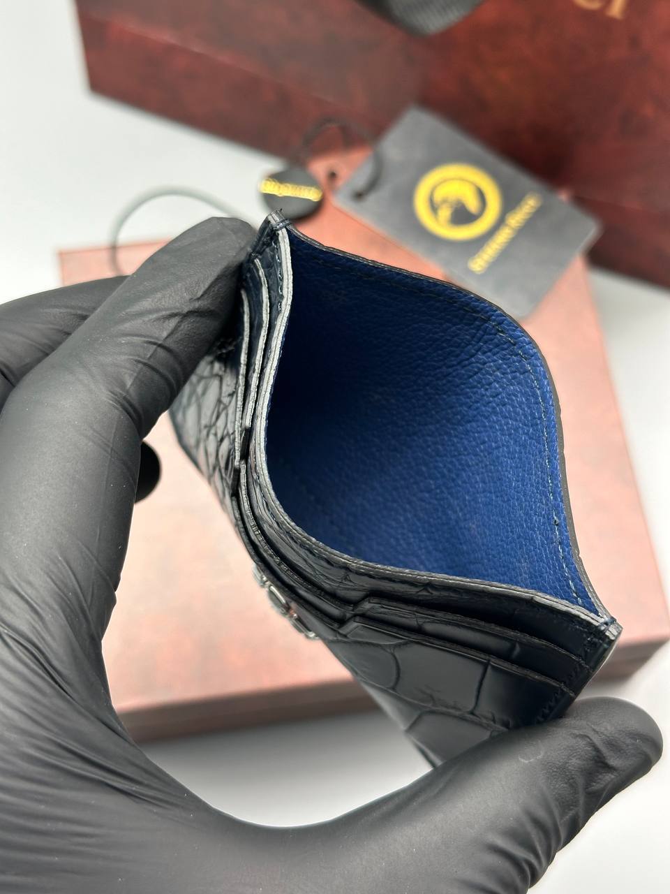 Картхолдер из кожи аллигатора насыщенного синего оттенка с изысканной золотой фурнитурой - воплощение безупречного вкуса.