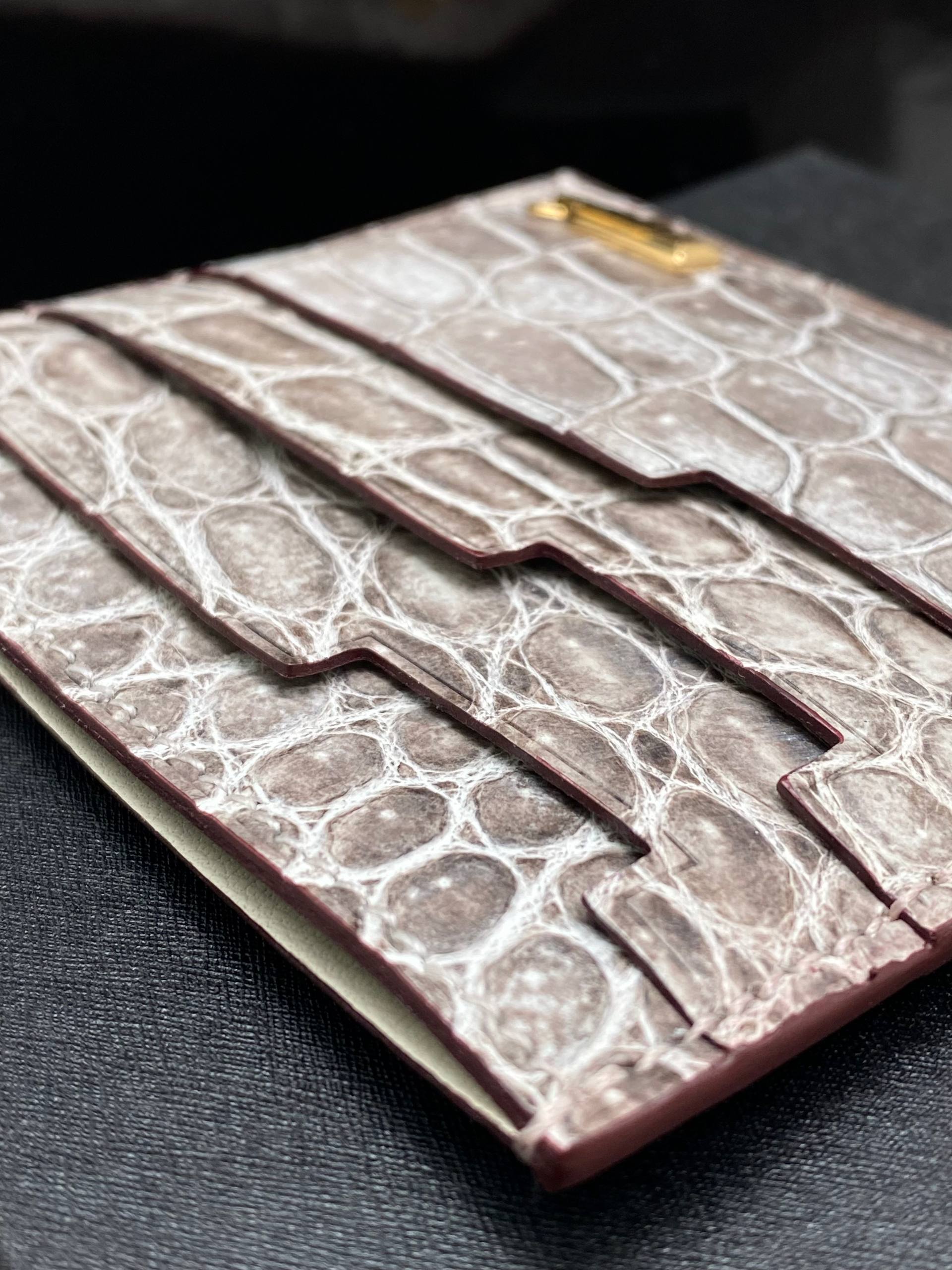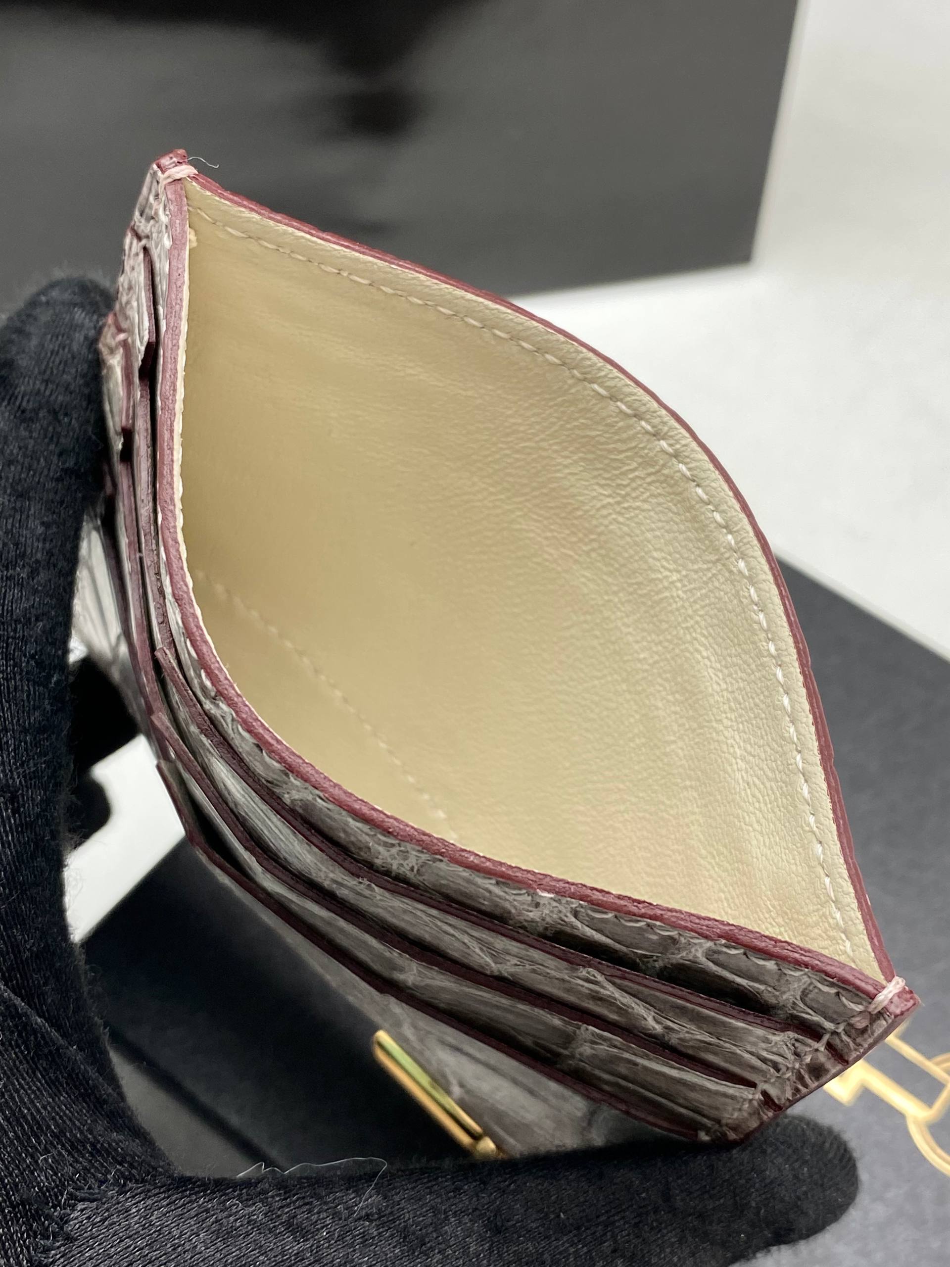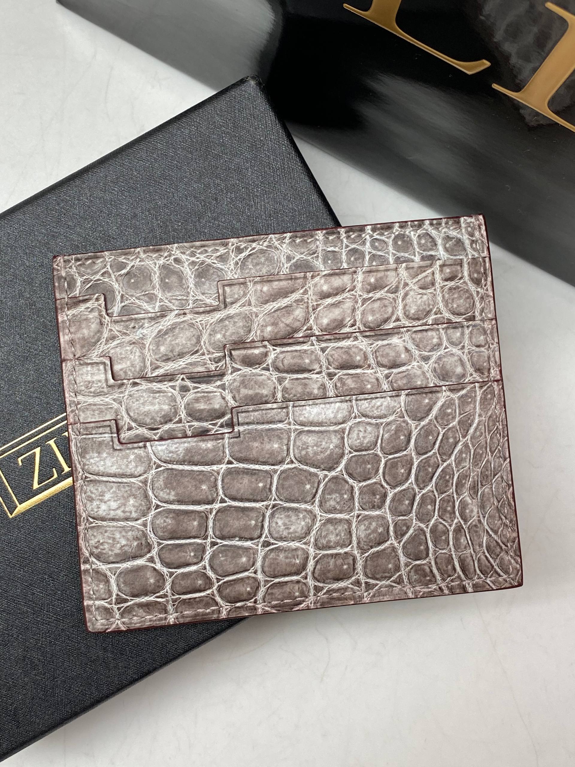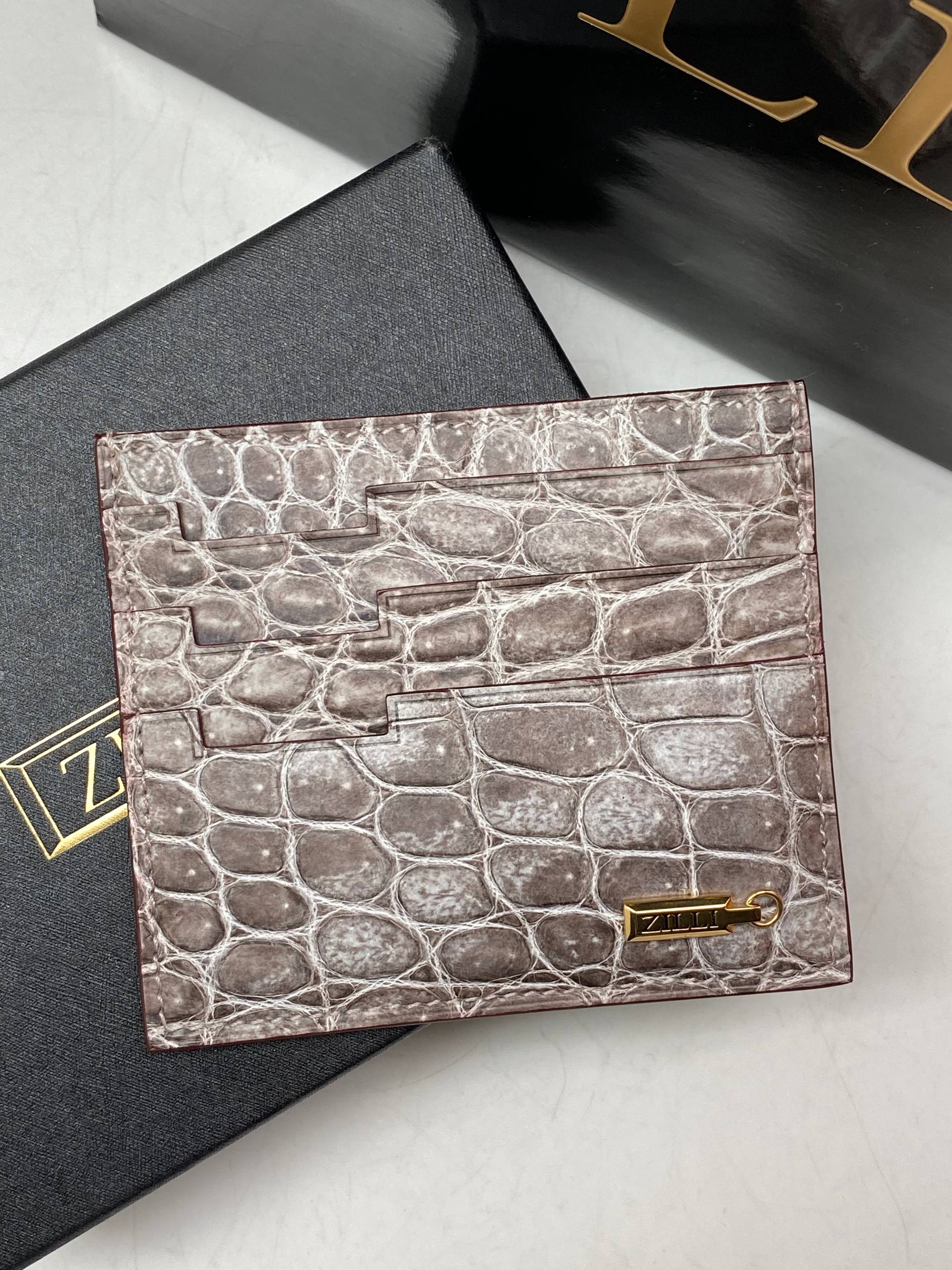 Изысканный кардхолдер из крокодиловой кожи: ледяной серый оттенок, чёткая фактура чешуи и золотая деталь — лаконичная роскошь в каждый карман.