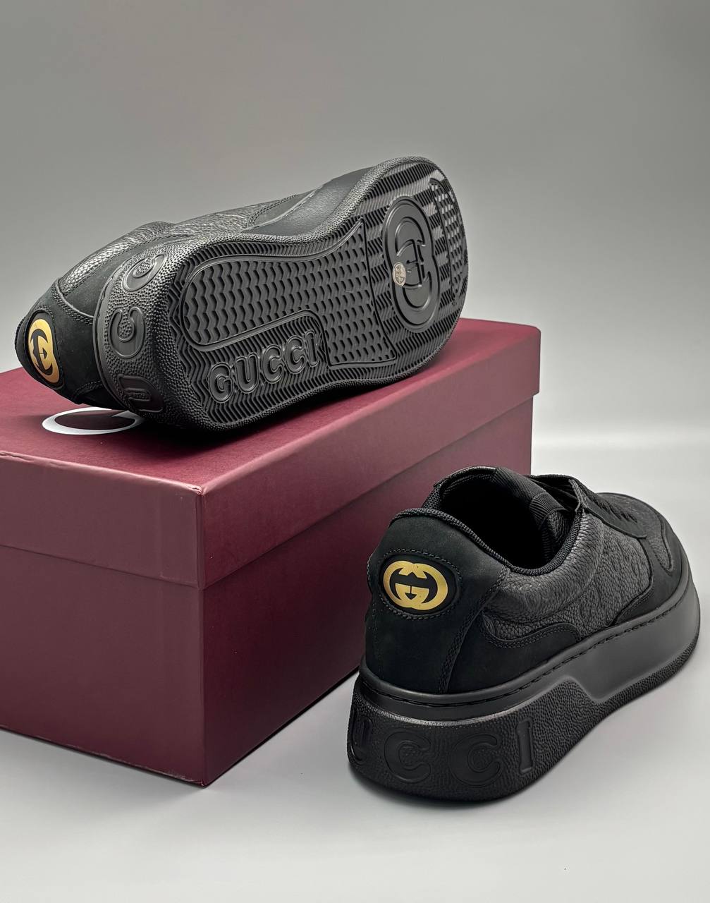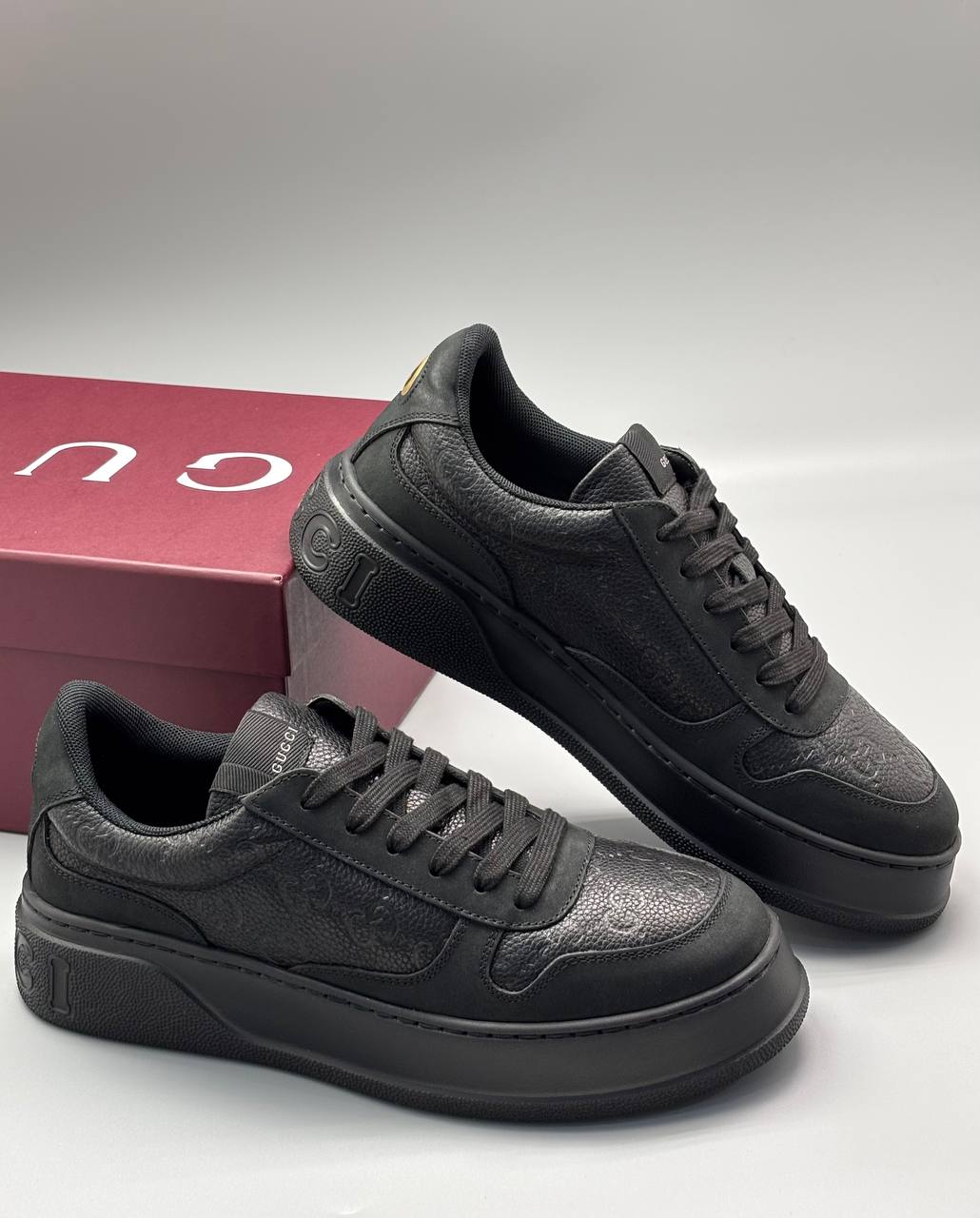 Чёрные кожаные кеды — сдержанная роскошь в каждом шве: глубокое тиснение монограммы, утолщённая подошва и идеальный городской силуэт для уверенного шага.