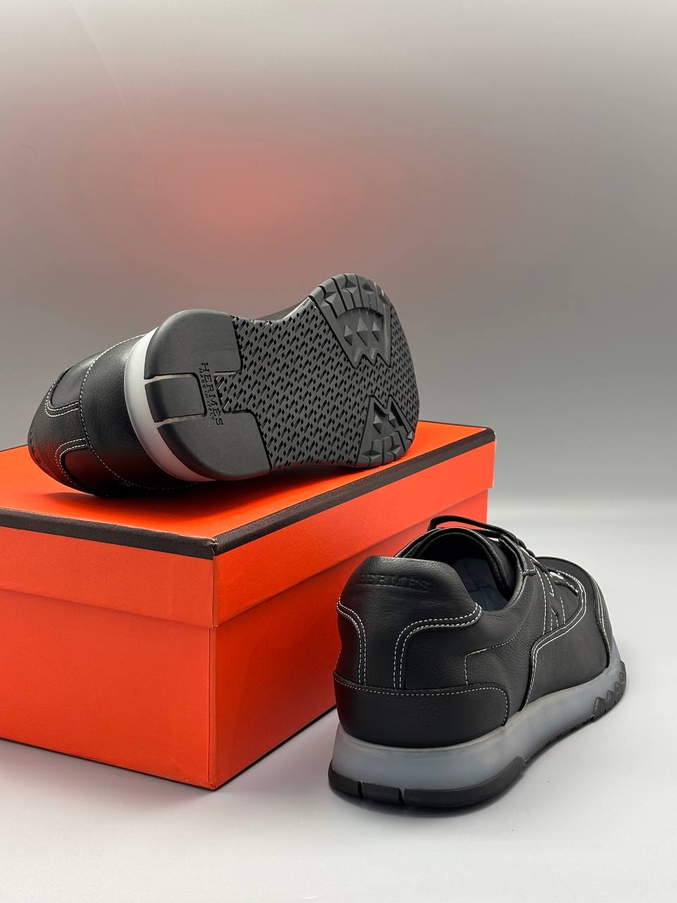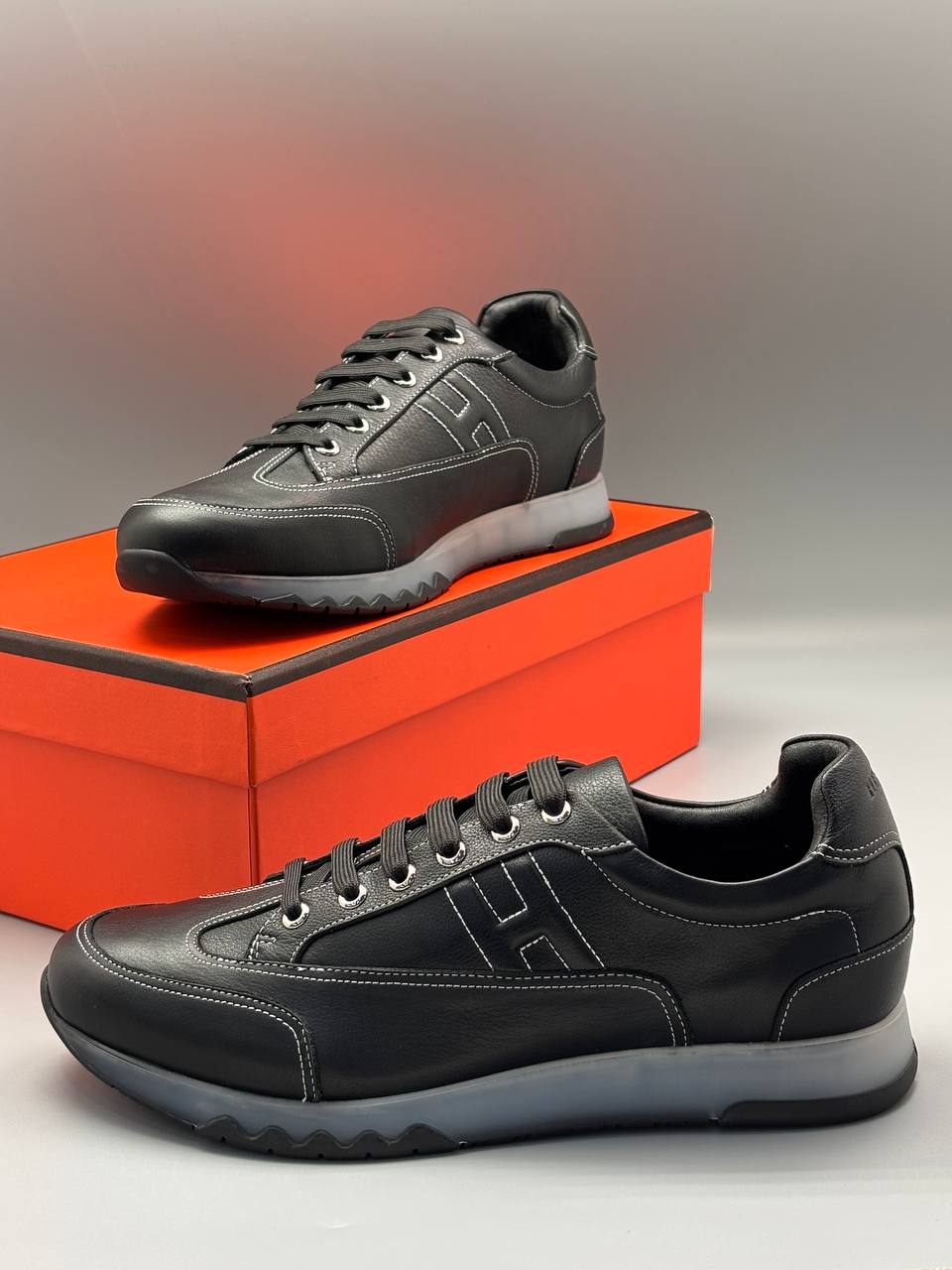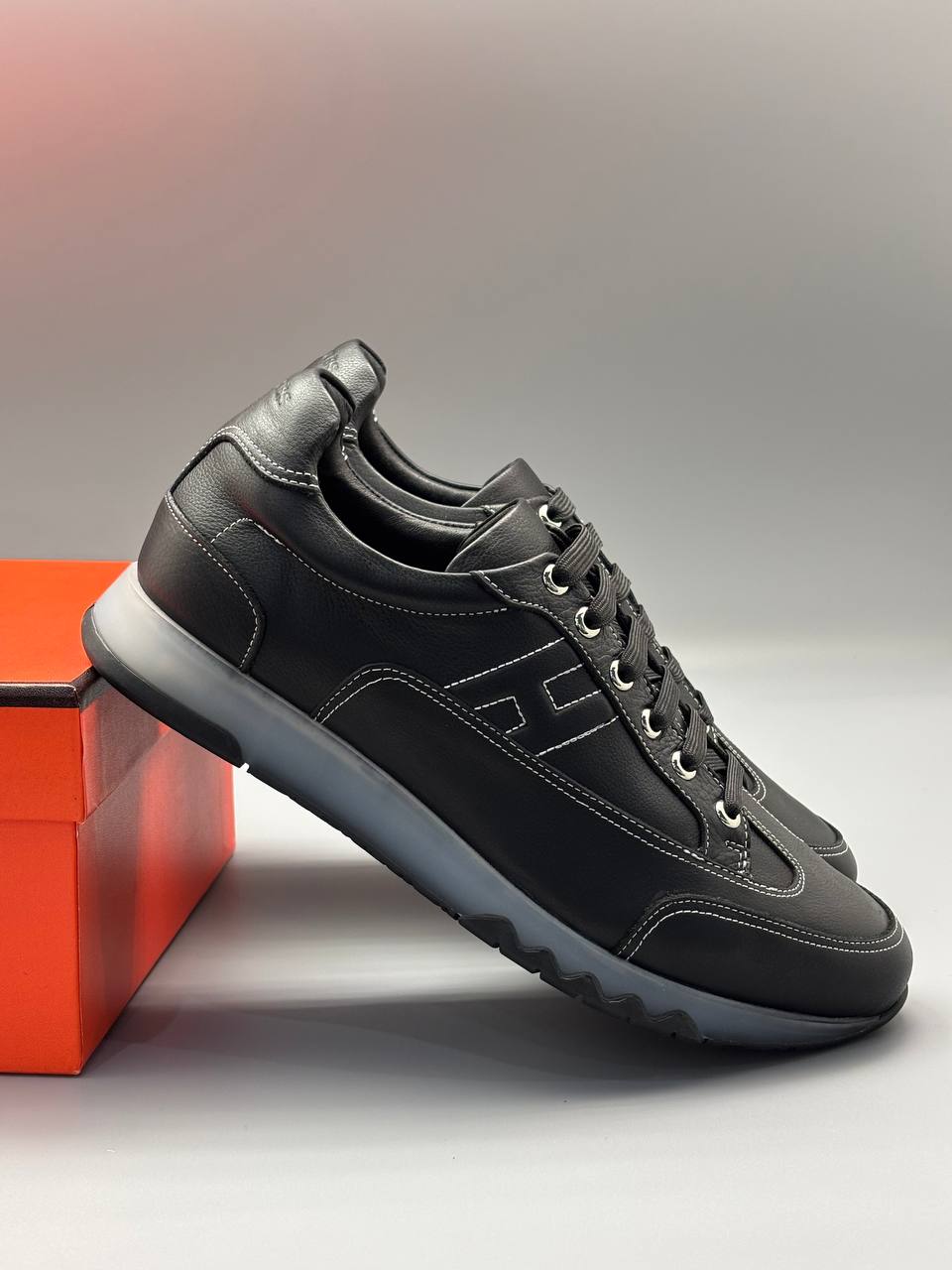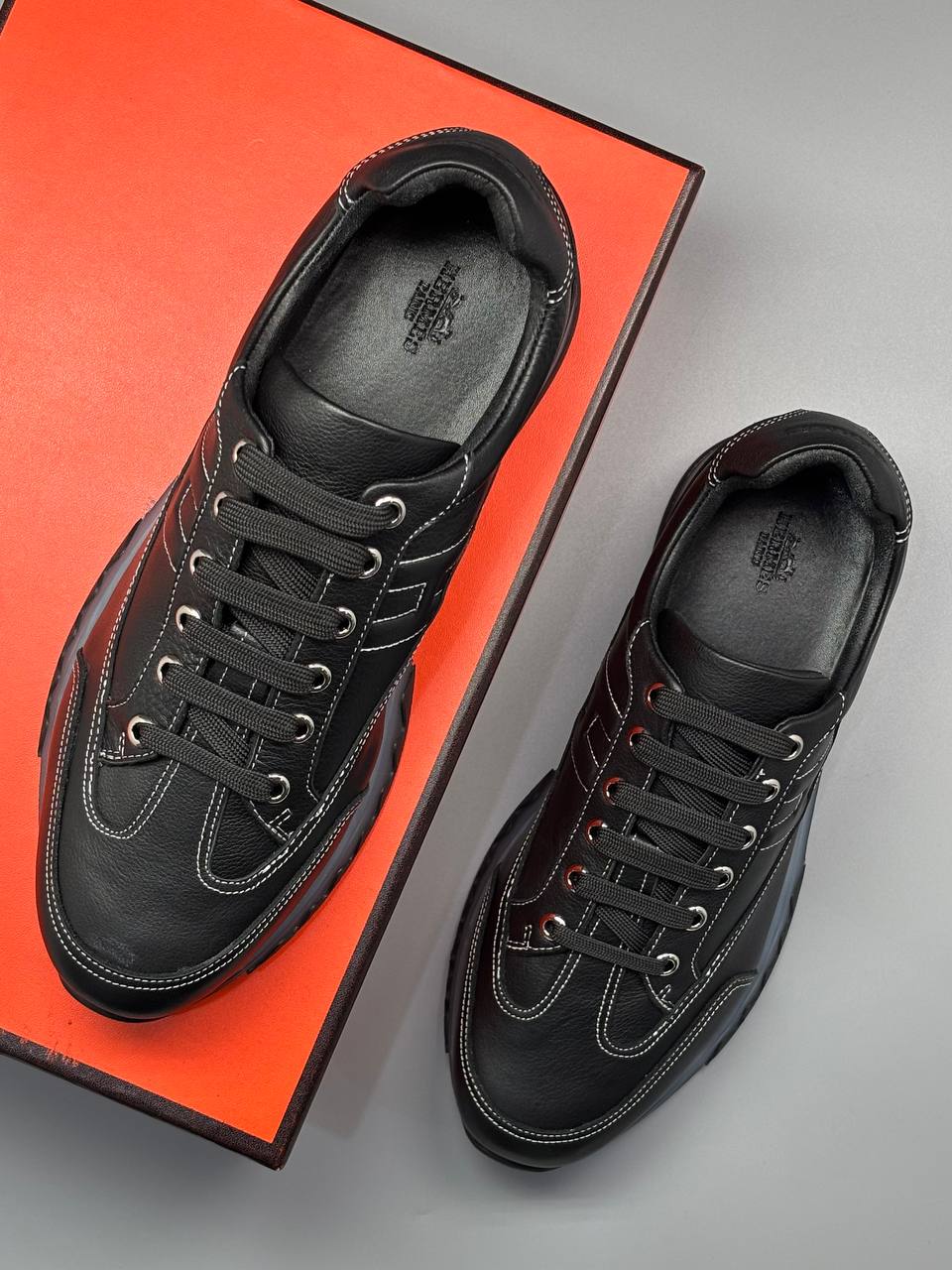 Современные чёрные кеды из мягкой зернистой кожи с контрастной подошвой — сдержанная элегантность и повседневный комфорт в каждом шаге.