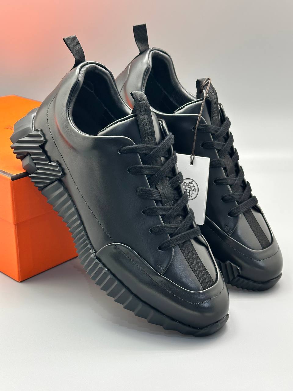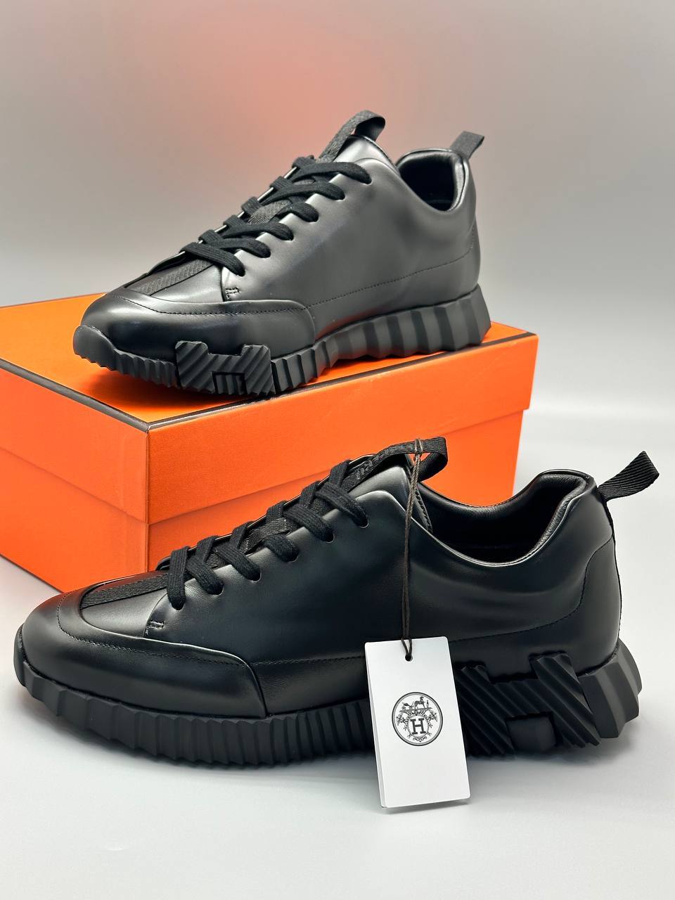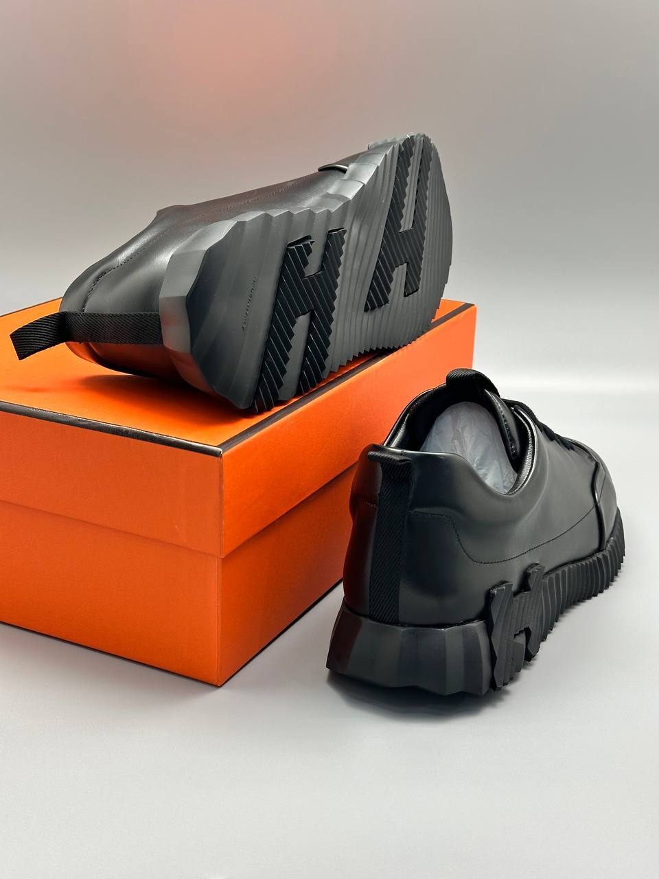 Кеды HermesGet sneaker из натуральной гладкой кожи белого цвета, серого и чёрного цвета с логотипом Бренда, на белой подошве.