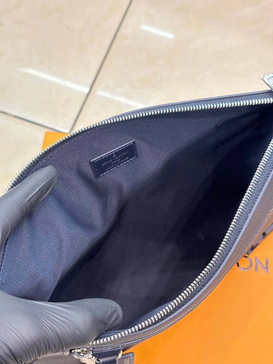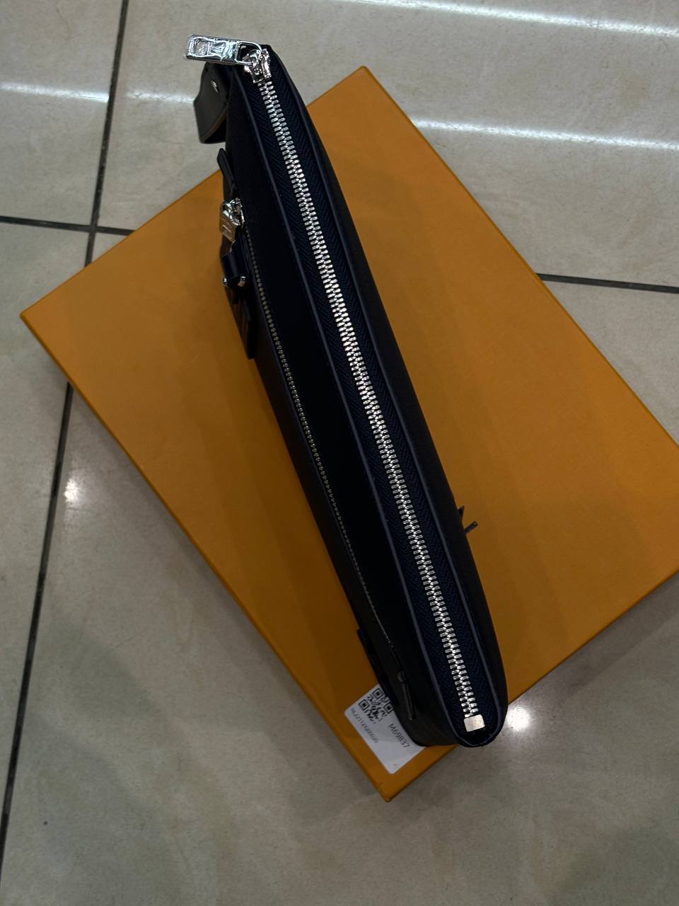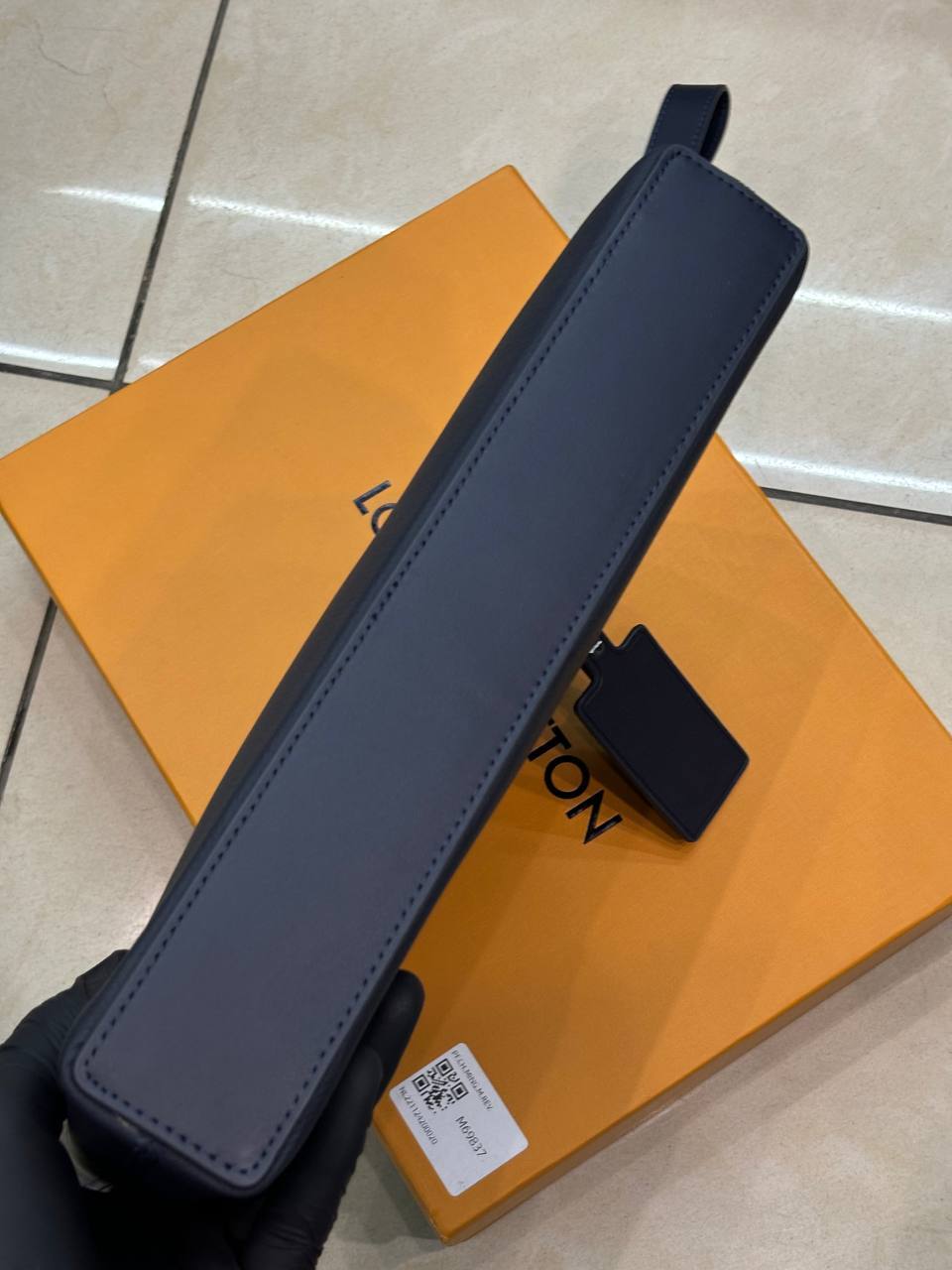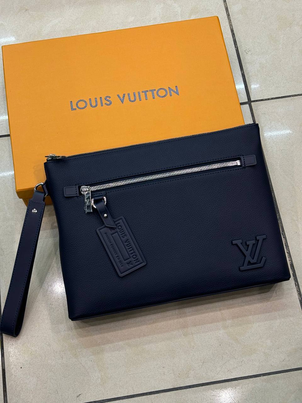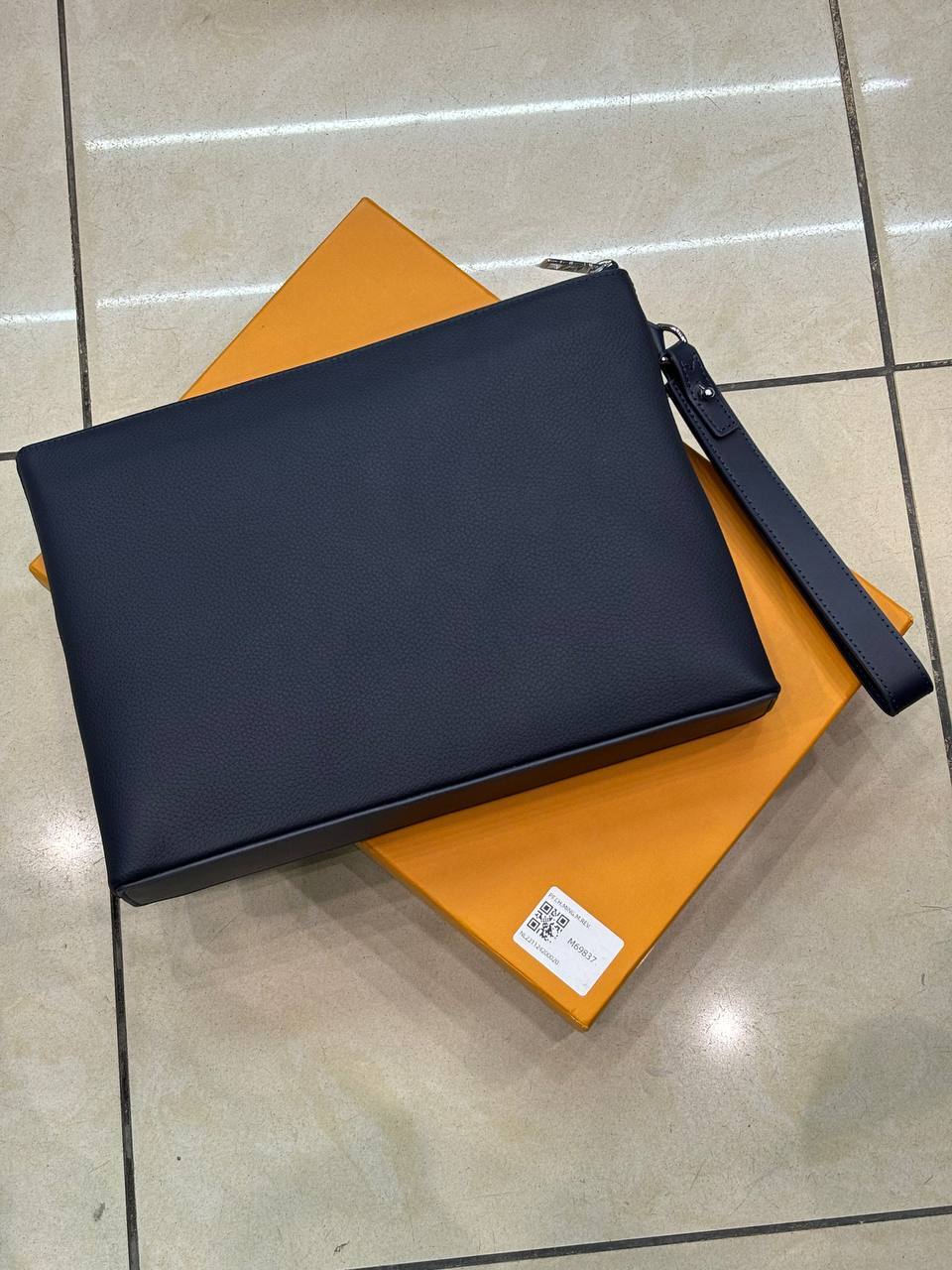 Клатч с культовым монограммным принтом, снабжённый практичным ремешком для ношения на запястье из гладкой тёмно-синей кожи с карманом на молнии.