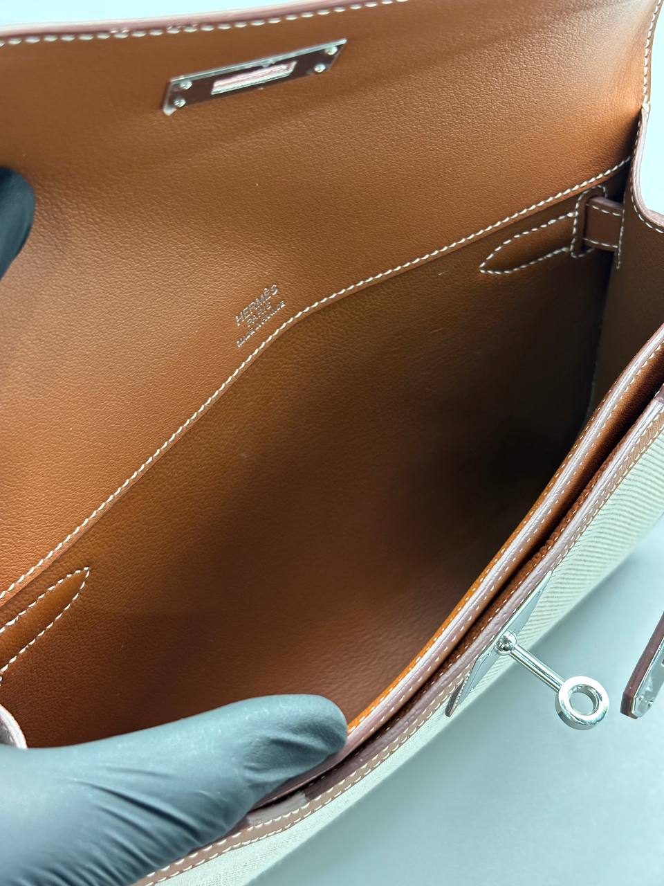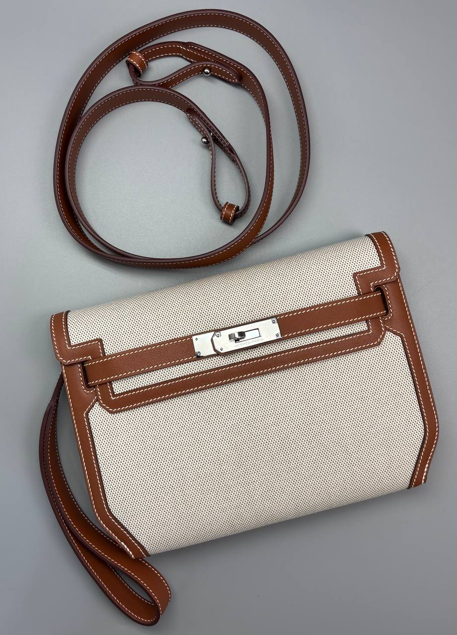 Клатч из тёплого бежевого канваса в обрамлении карамельной кожи со строгой серебристой застёжкой — идеальный спутник для вечерних прогулок и деловых выходов.