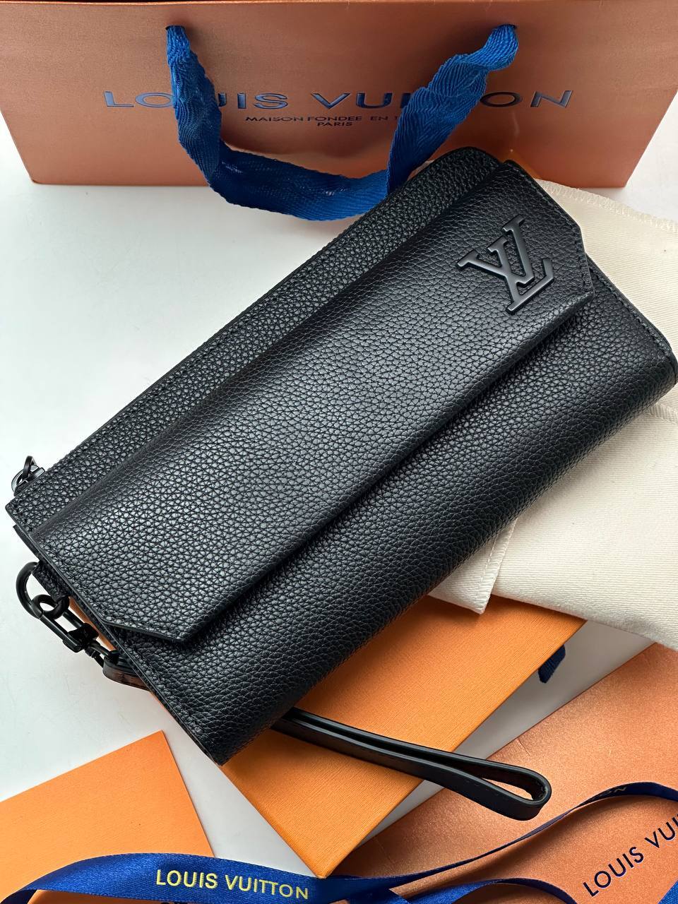 Стильный кожаный клатч черного цвета. Практичная модель на молнии с фирменным тиснением.