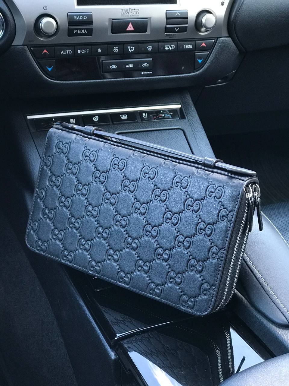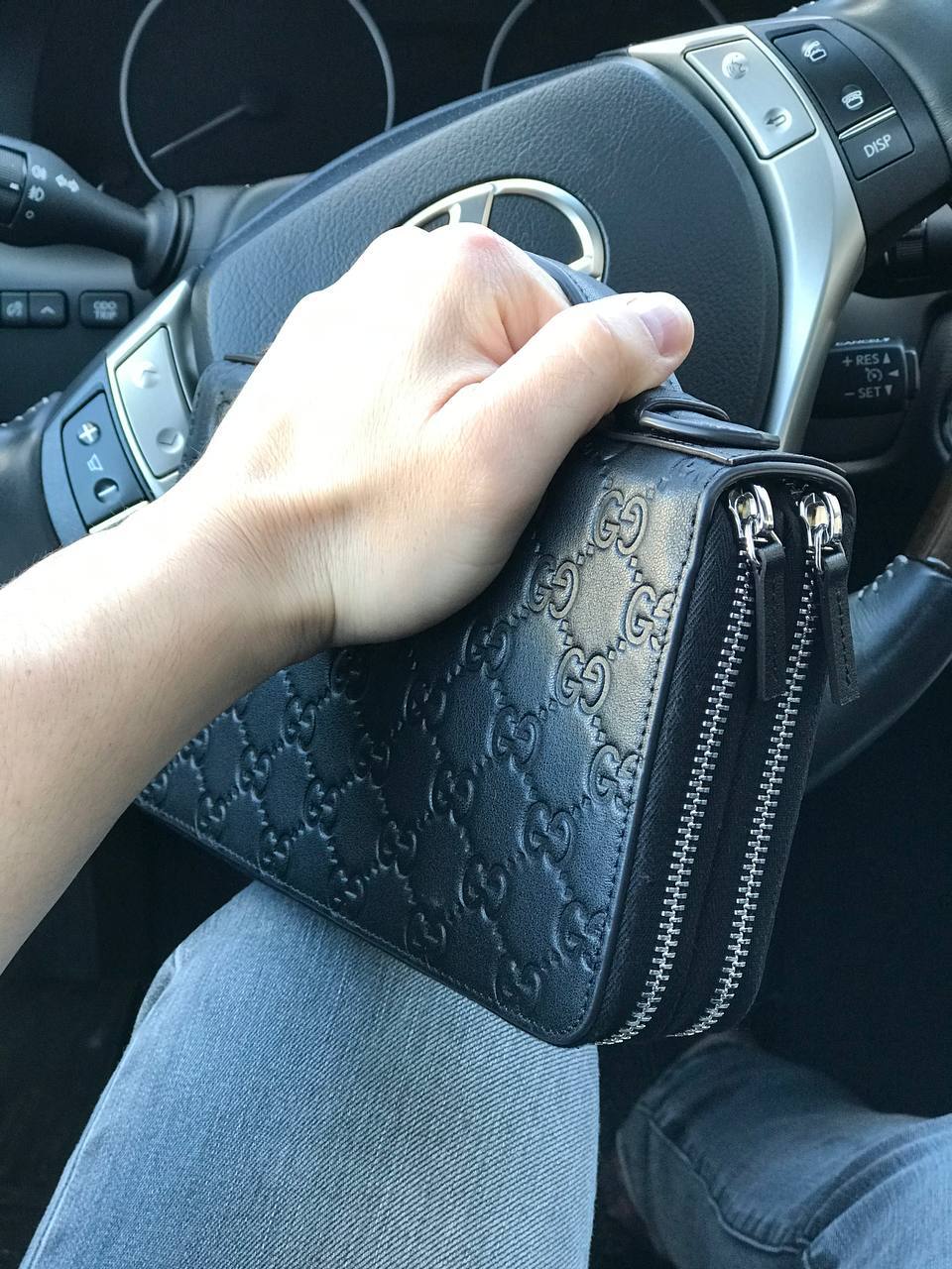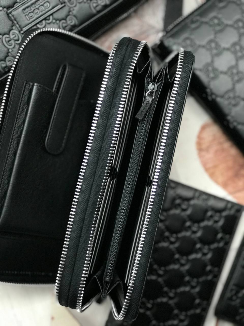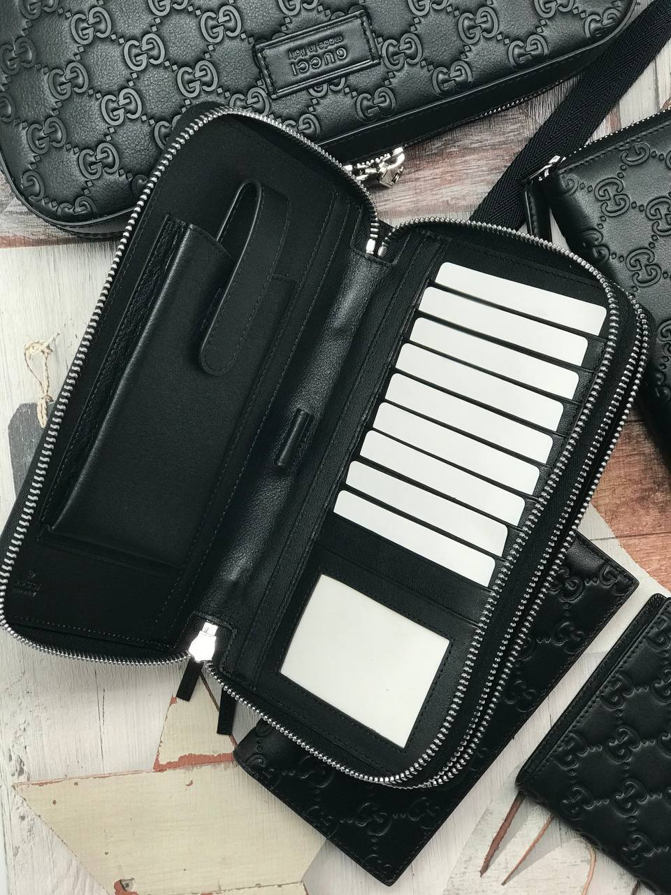 Стильный кожаный клатч с фирменным узором из переплетающихся логотипов GG. Идеально дополнит как повседневный, так и вечерний образ.