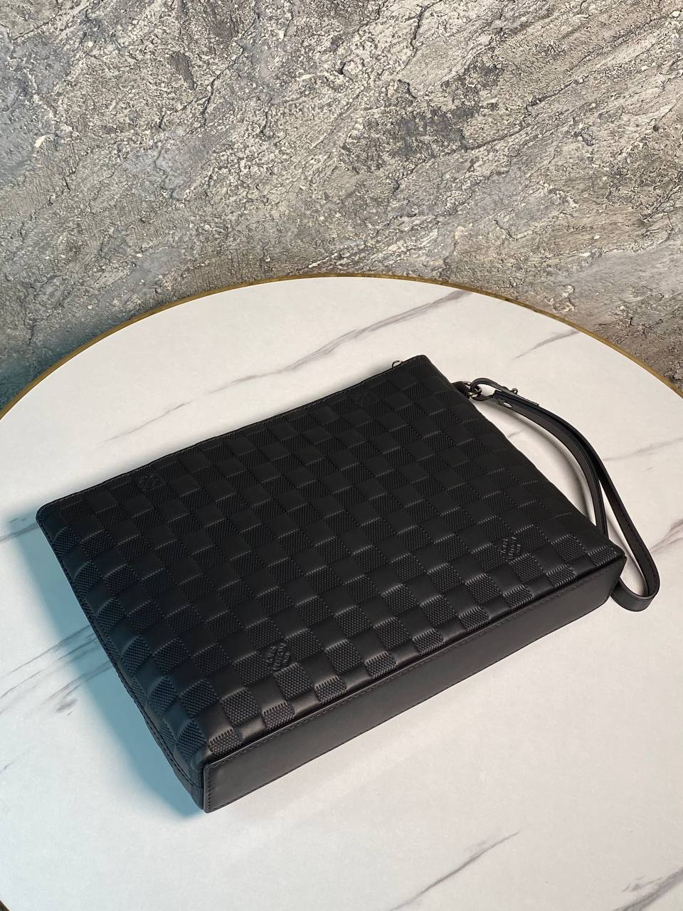 Чёрный клатч из кожи с тиснением в клетку от французского бренда. Лаконичный дизайн с серебристой молнией.