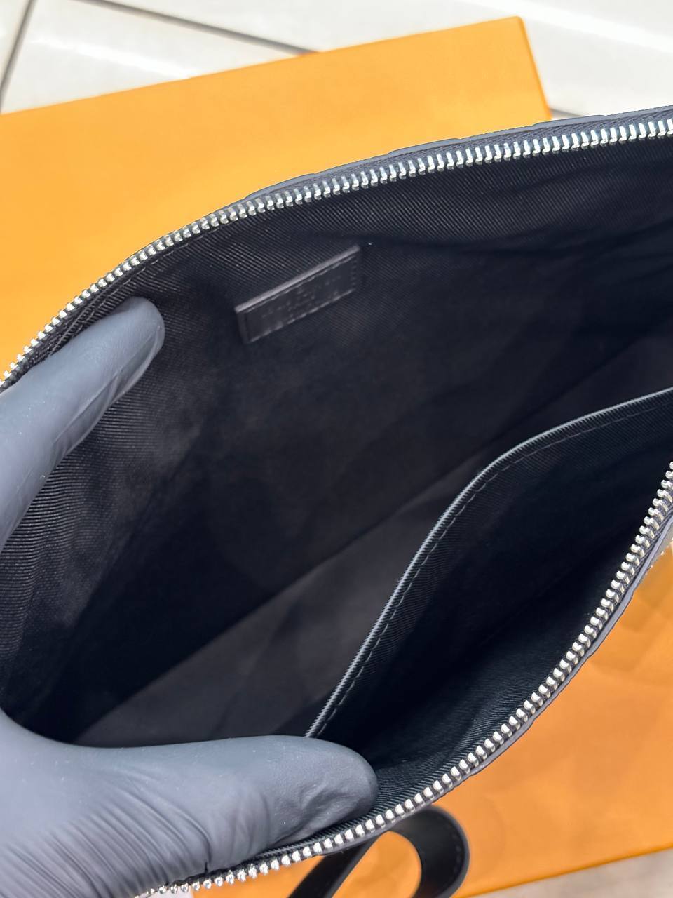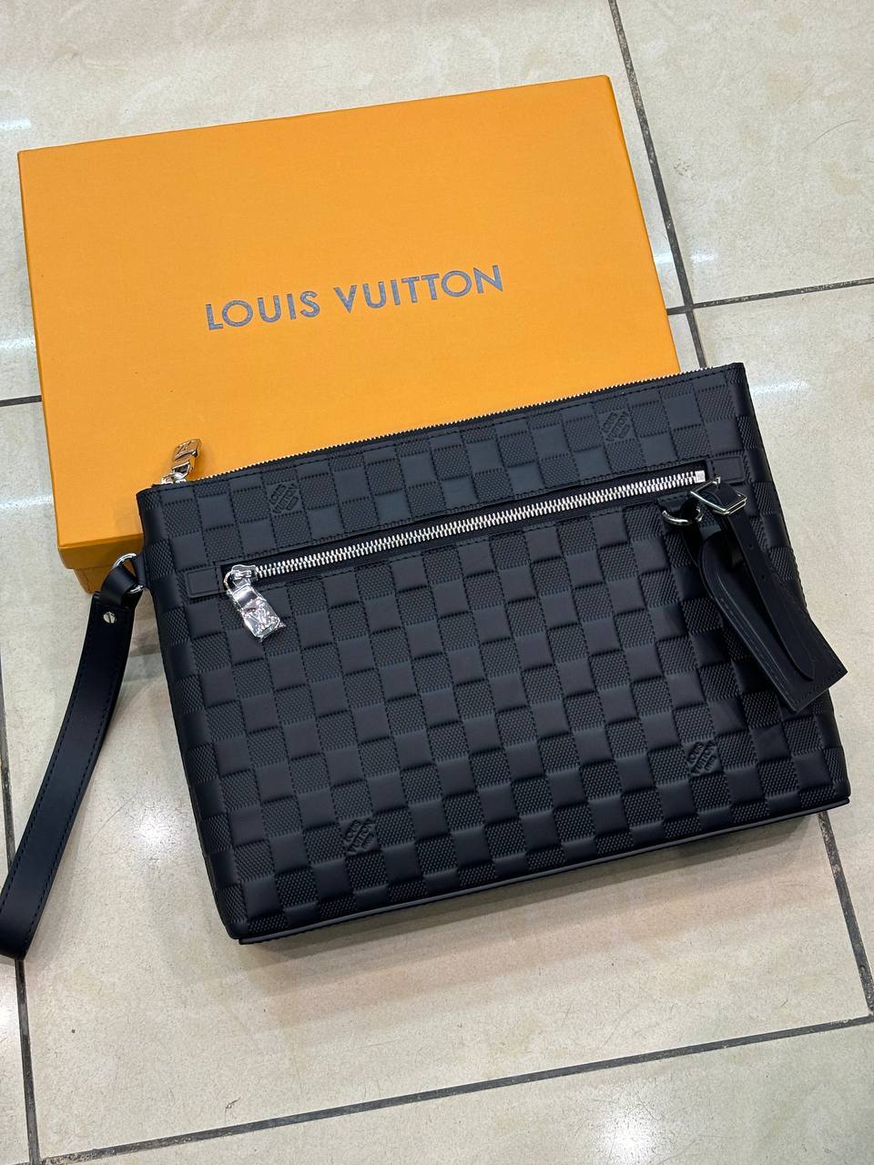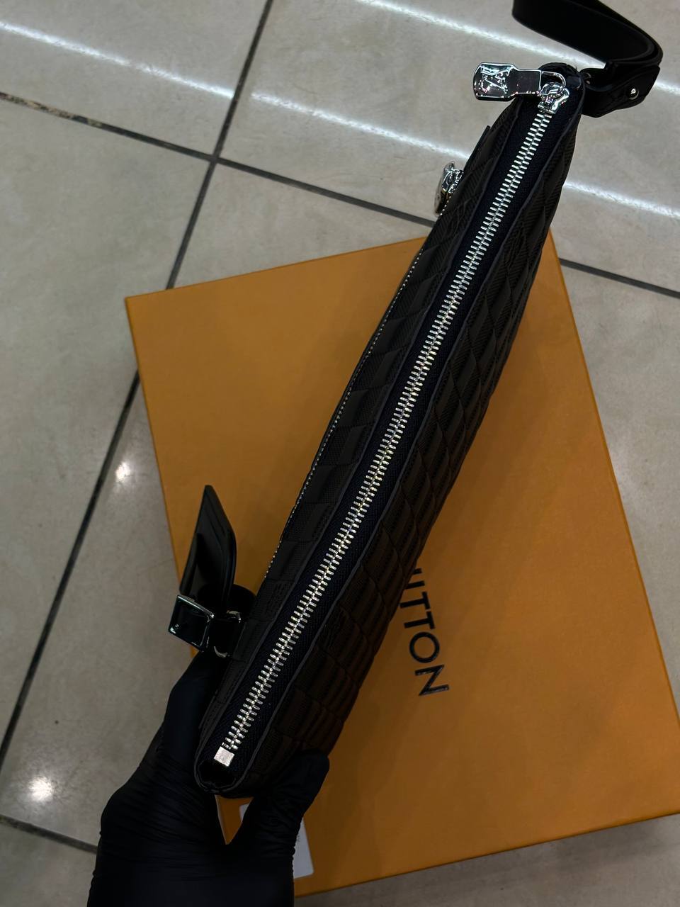 Классический монограммный узор в сочетании плетений черной кожи и карманом на молнии создают изысканный мужской клатч от, сочетающий традиции и современность.