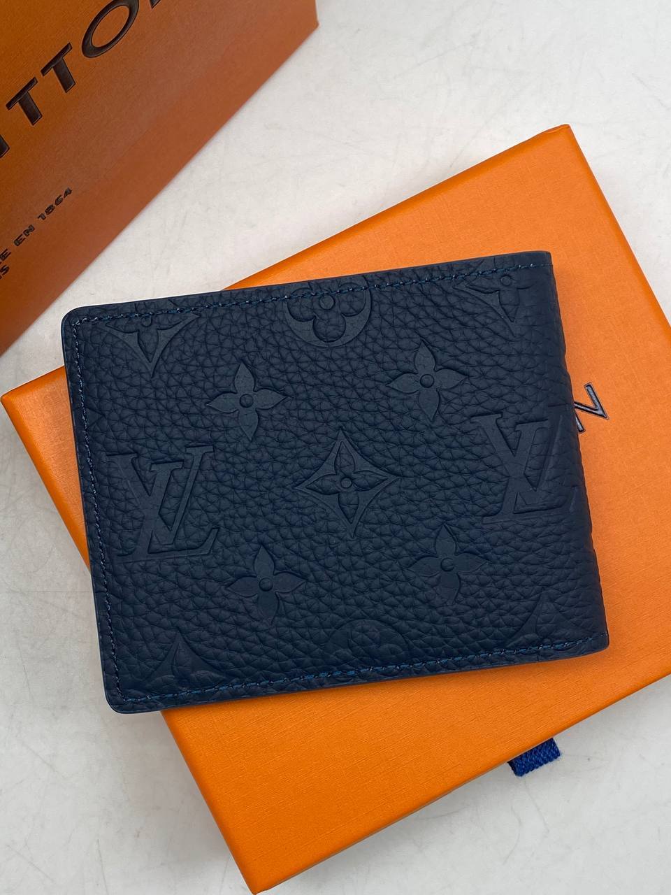 Кожаный бумажник с тисненым монограммным узором в темно-синем цвете, выполненный в строгом классическом стиле.