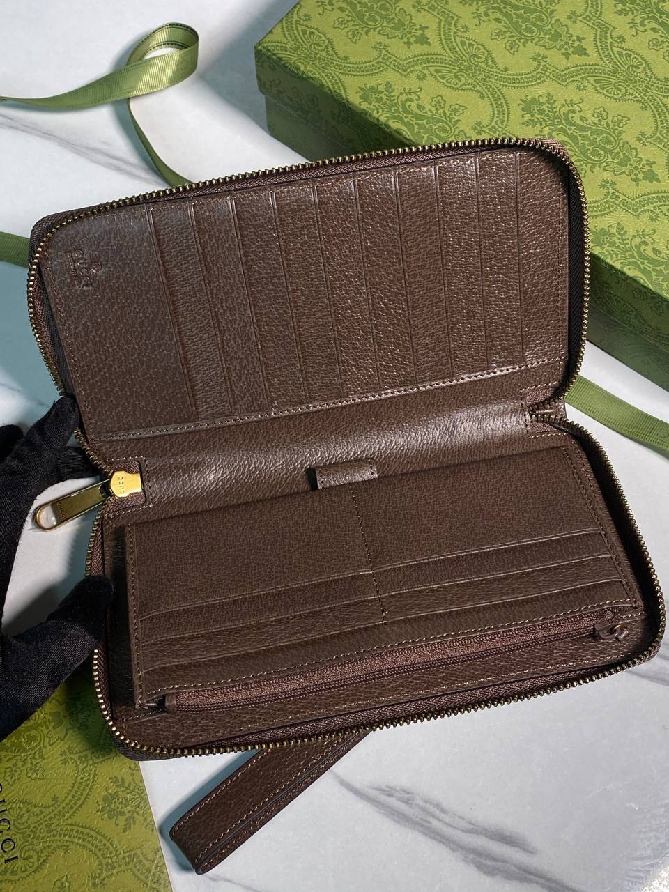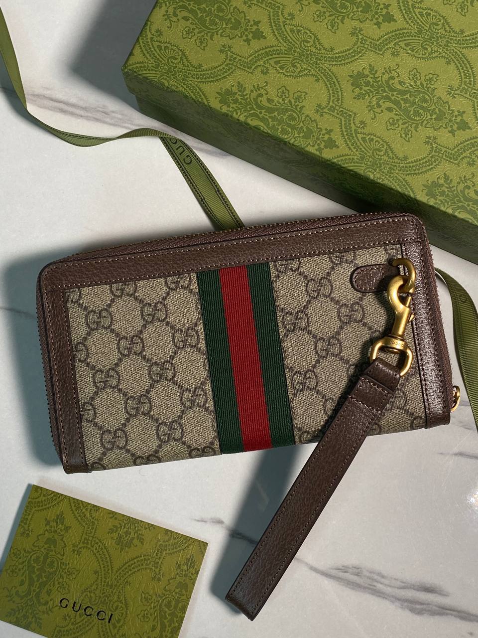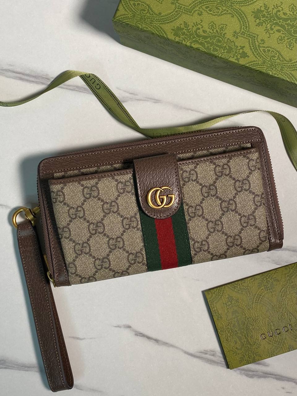 Классический кошелек из фирменного канваса с монограммой, украшенный характерной для бренда полосатой лентой в красно-зеленых тонах. Изысканный и практичный аксессуар.