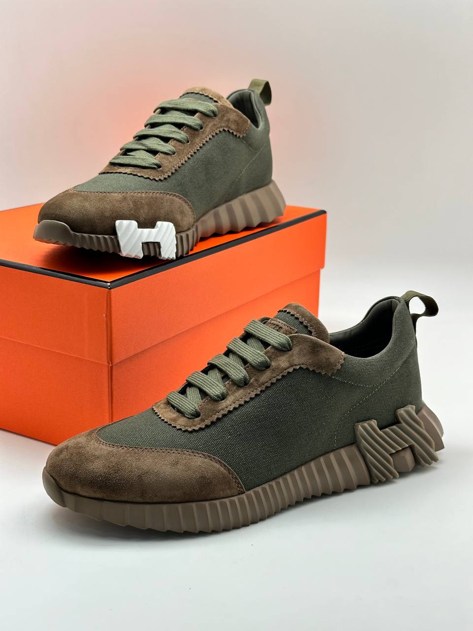 Комфортные повседневные кроссовки из премиальных материалов. Текстильный верх цвета хаки и замшевые вставки. Широкая подошва с узнаваемым дизайном.