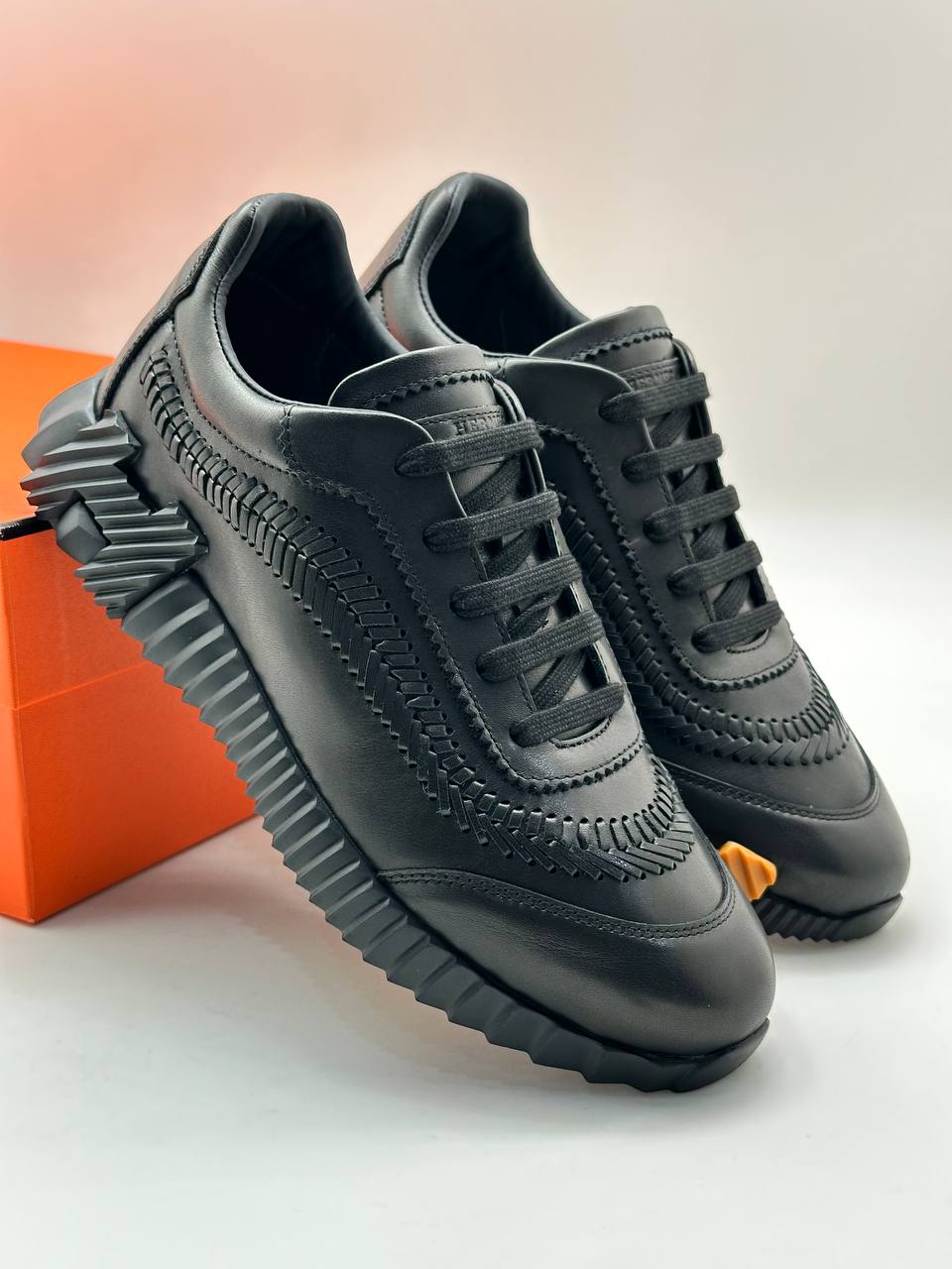 Черные кожаные кроссовки в спортивном стиле с рельефной подошвой и плетеным узором от люксового бренда.