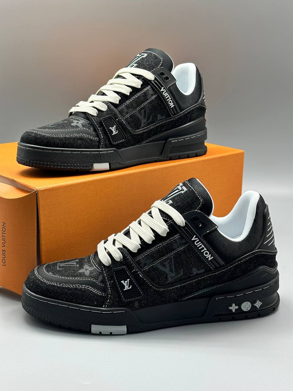 Модные кроссовки из денима с декоративной строчкой и массивной черной подошвой от люксового бренда.