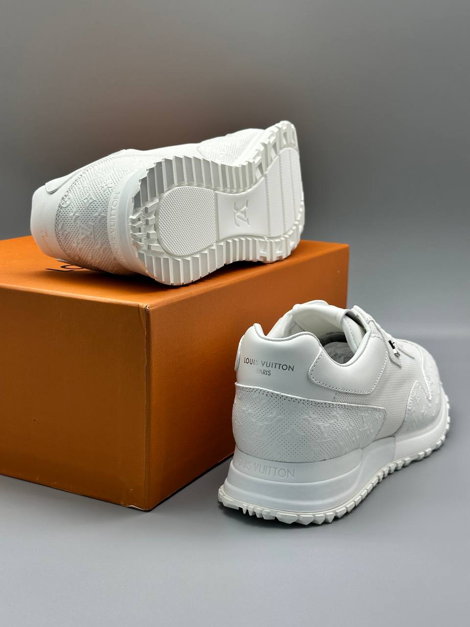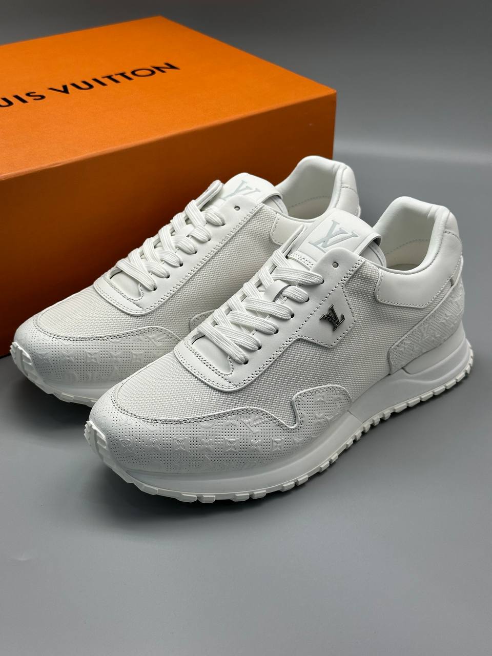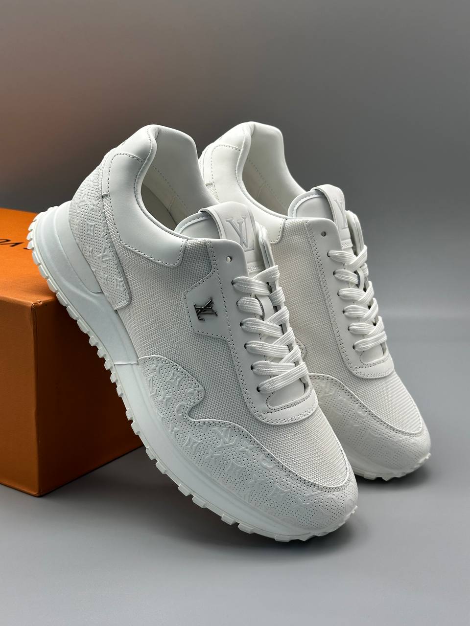 Белые кроссовки с текстурированными кожаными вставками и металлическим логотипом бренда. Современный urban-стиль с акцентом на качество материалов и узнаваемость бренда.