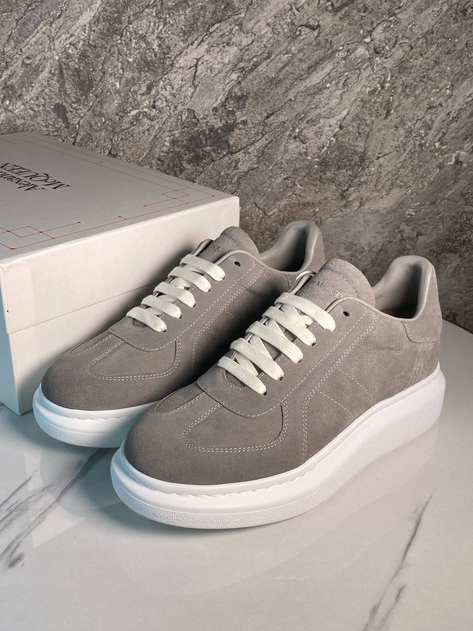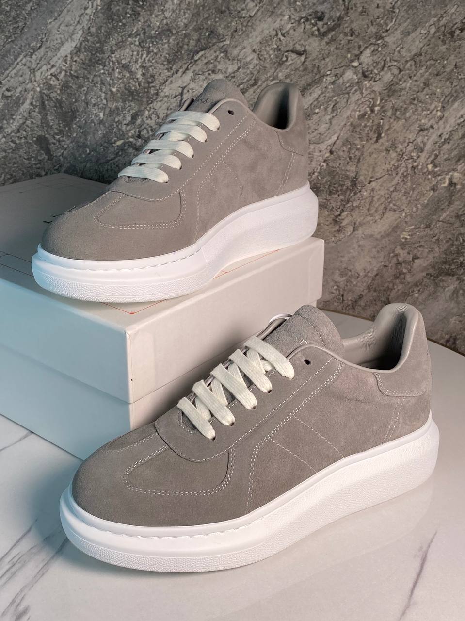 Серые кроссовки из натуральной замши в минималистичном стиле с массивной белой подошвой.