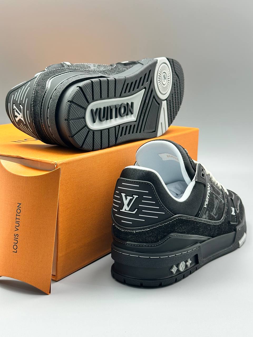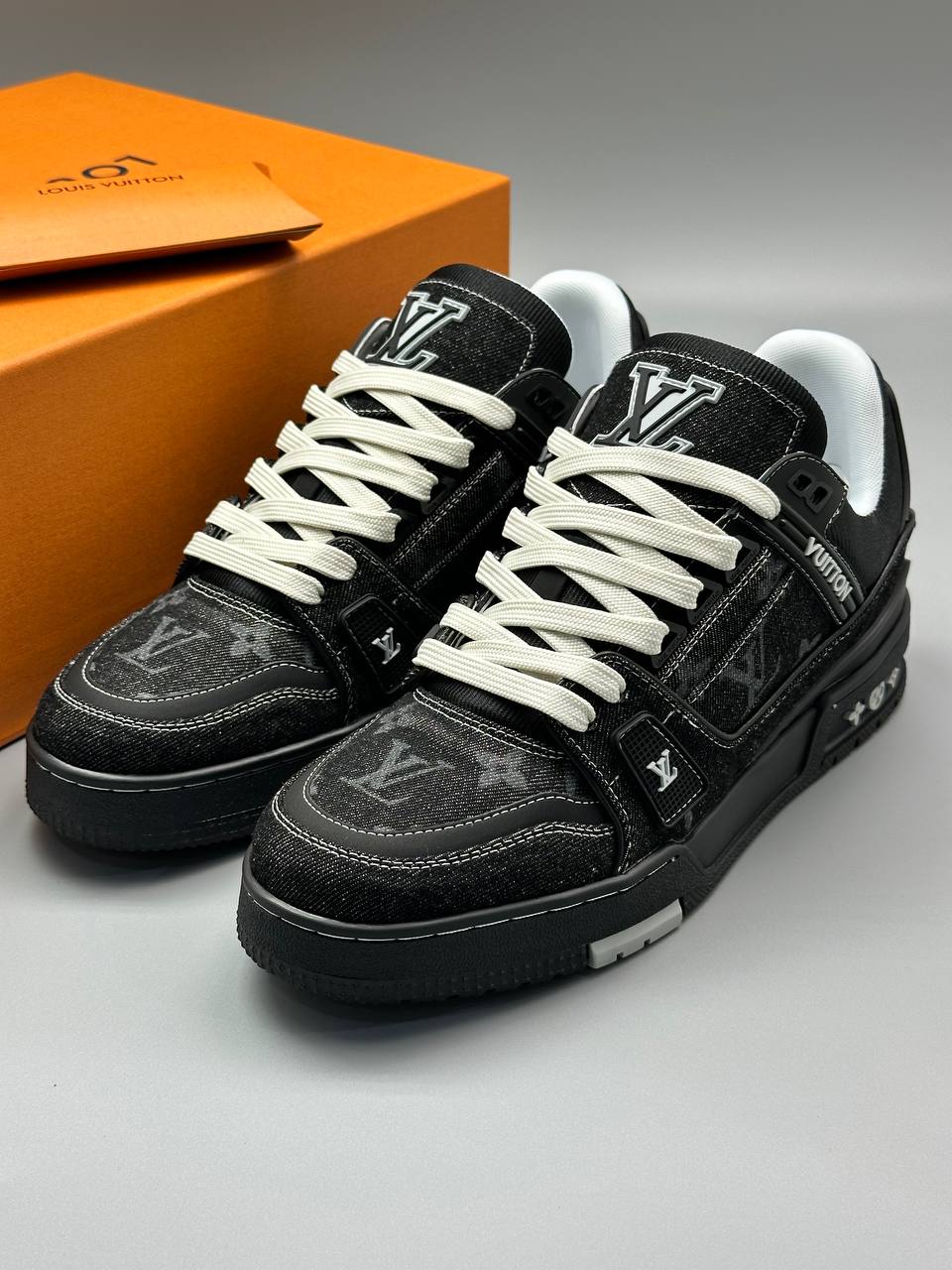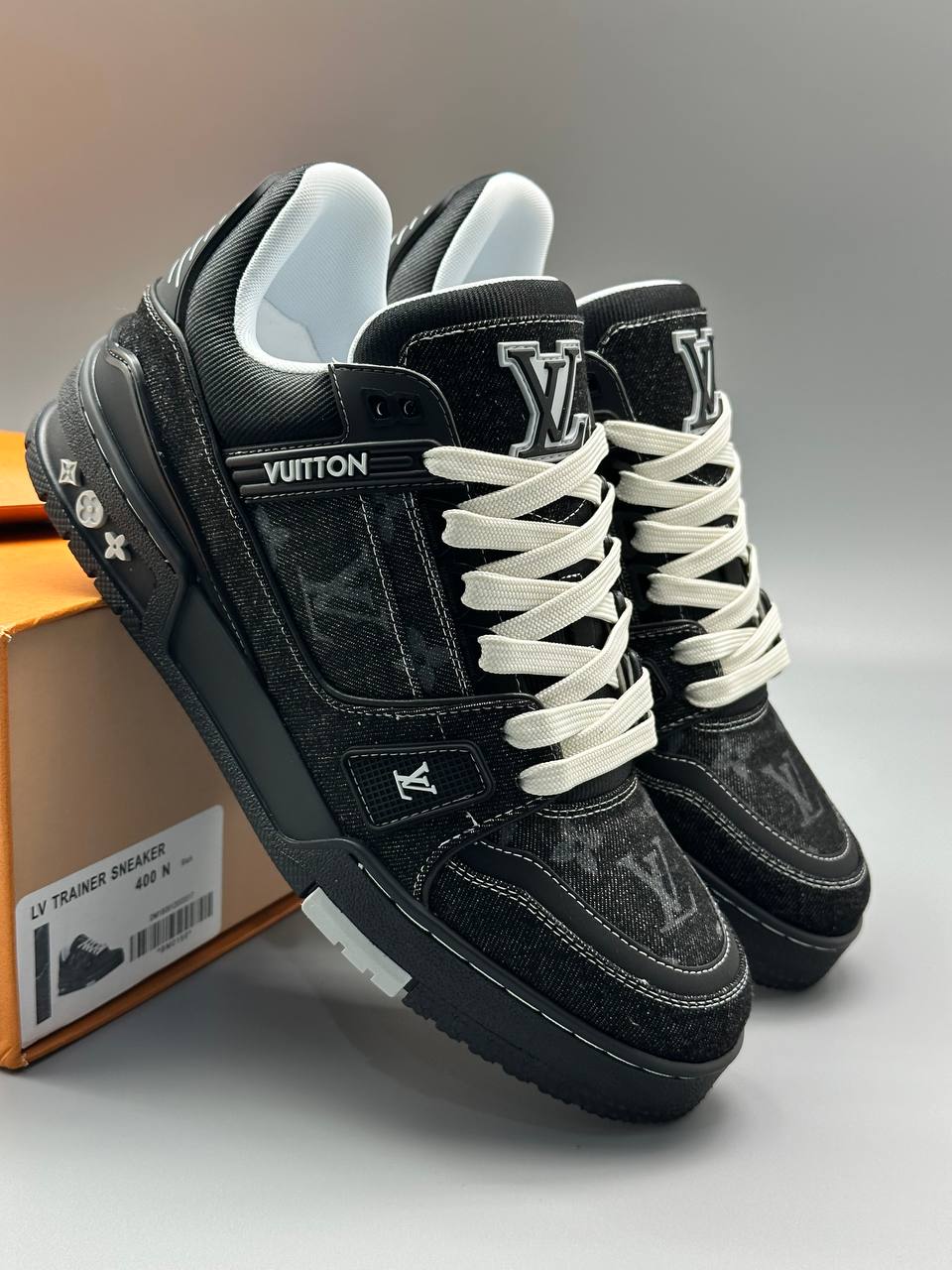 Модные кроссовки из денима с декоративной строчкой и массивной черной подошвой от люксового бренда.
