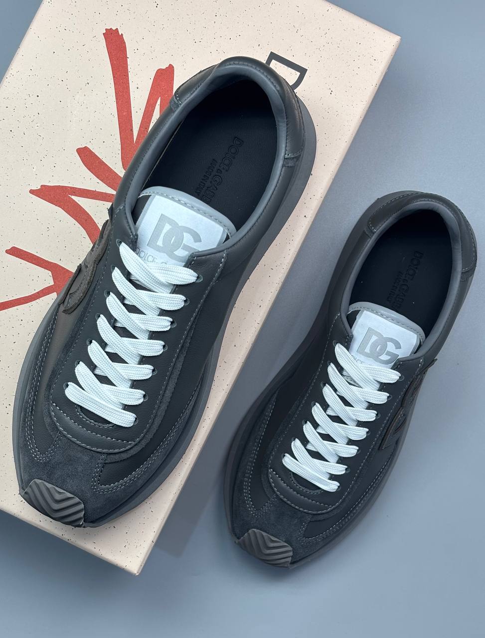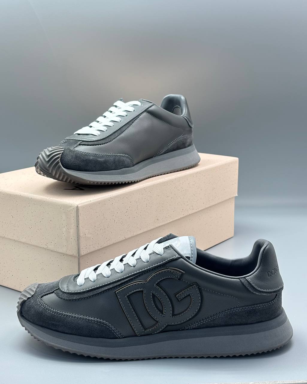 Сдержанные кроссовки в дымчато‑серых тонах: мягкая замша и гладкая кожа, рельефный логотип и утончённая платформа — идеальный союз комфорта.
