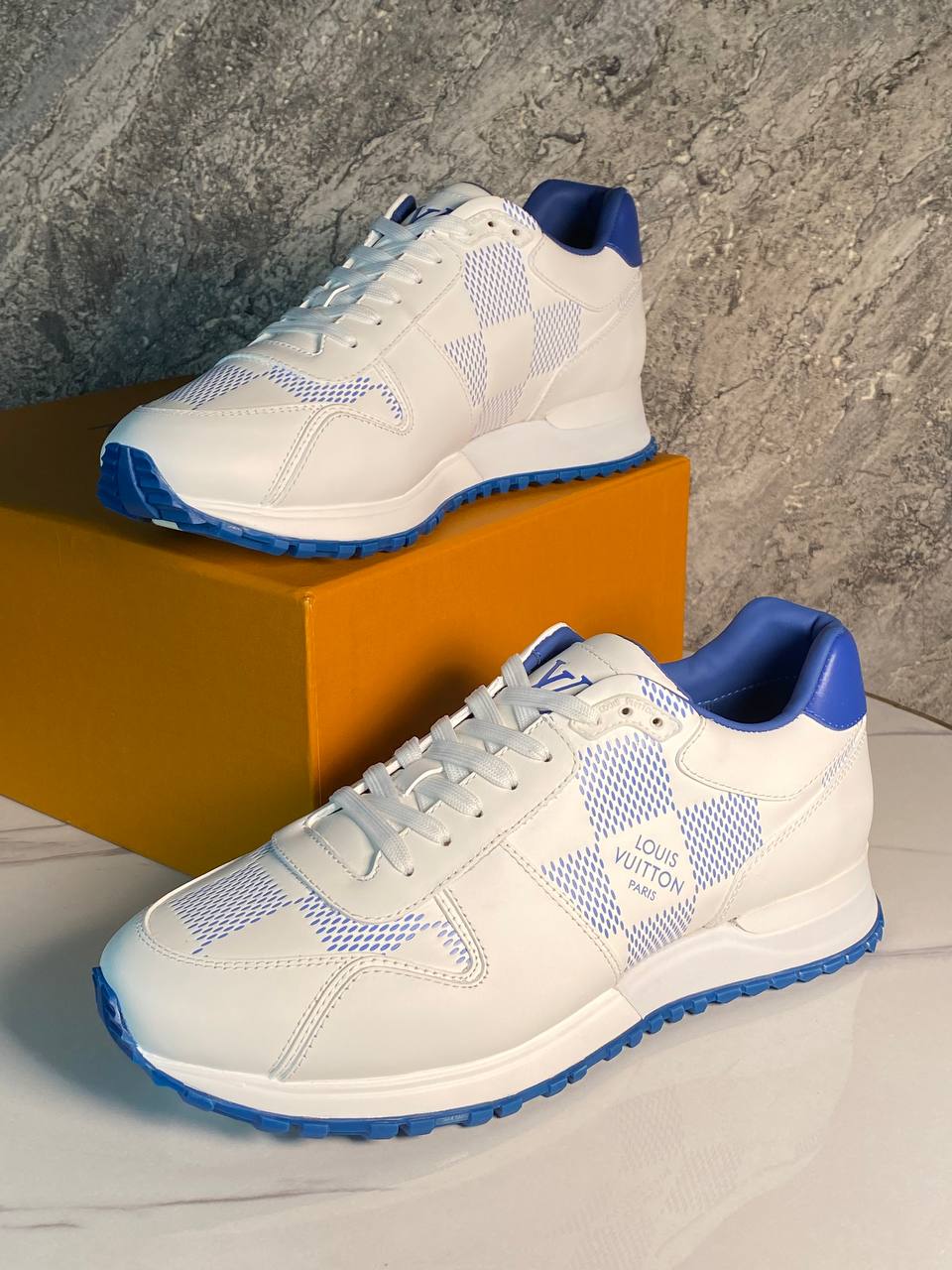 Кроссовки из премиальной кожи с принтом и с контрастной синей подошвой. Стильный спортивный дизайн с монограммой бренда.