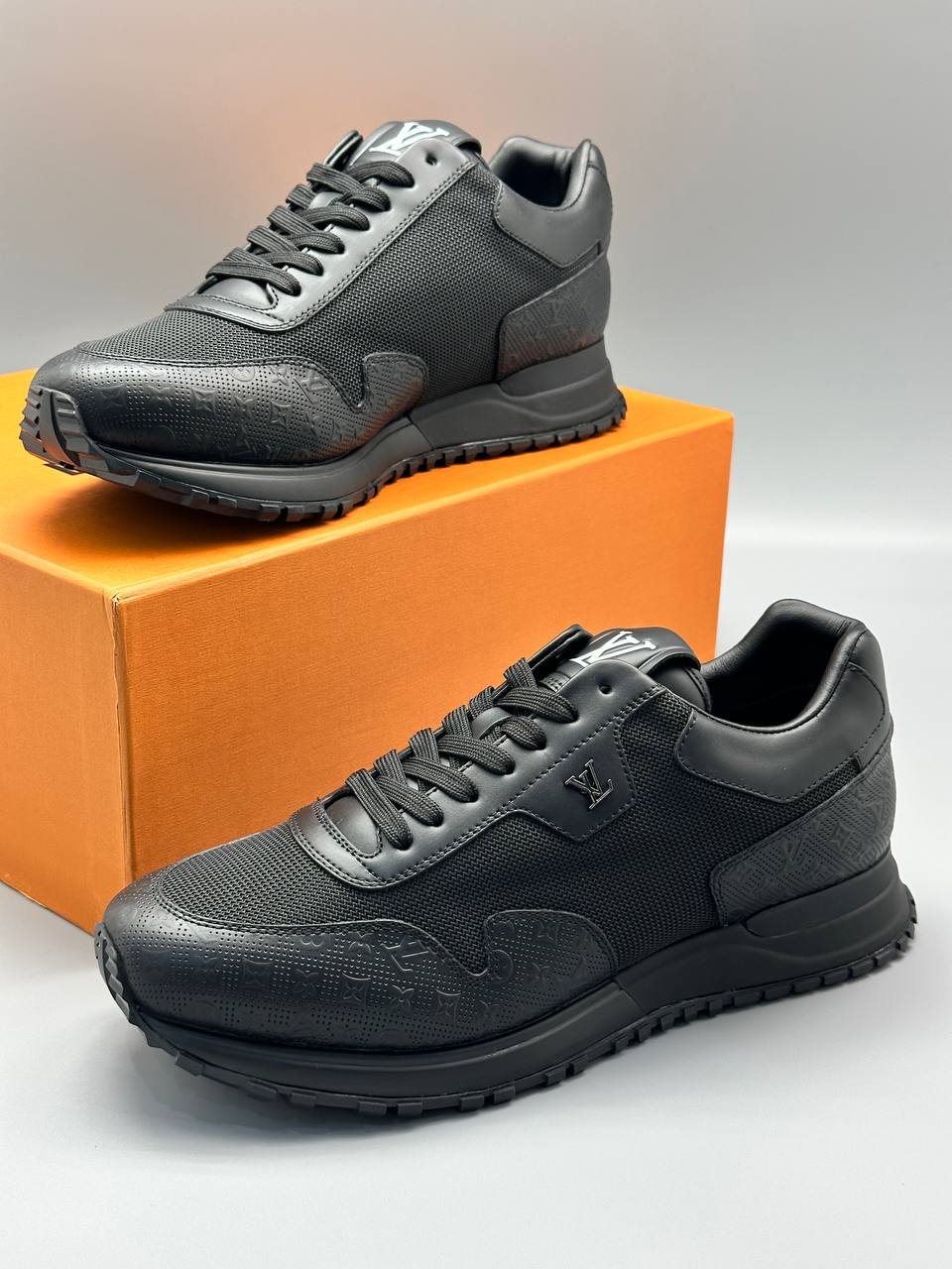 Мужские кроссовки в полностью черном исполнении, сочетающие гладкую кожу и сетчатый текстиль с тиснением знаменитого паттерна бренда в современном урбанистическом дизайне.
