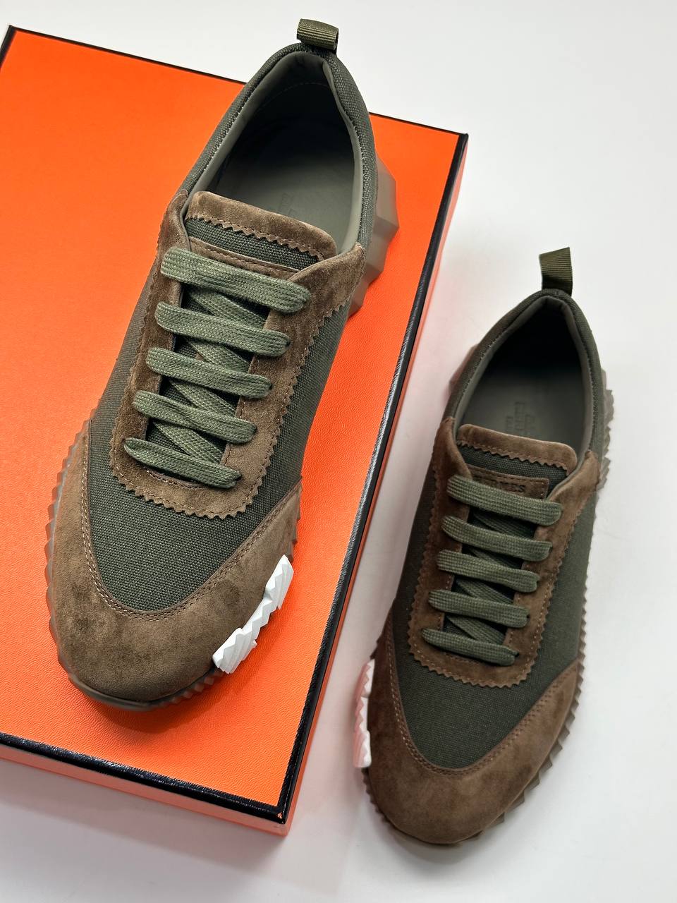 Комфортные повседневные кроссовки из премиальных материалов. Текстильный верх цвета хаки и замшевые вставки. Широкая подошва с узнаваемым