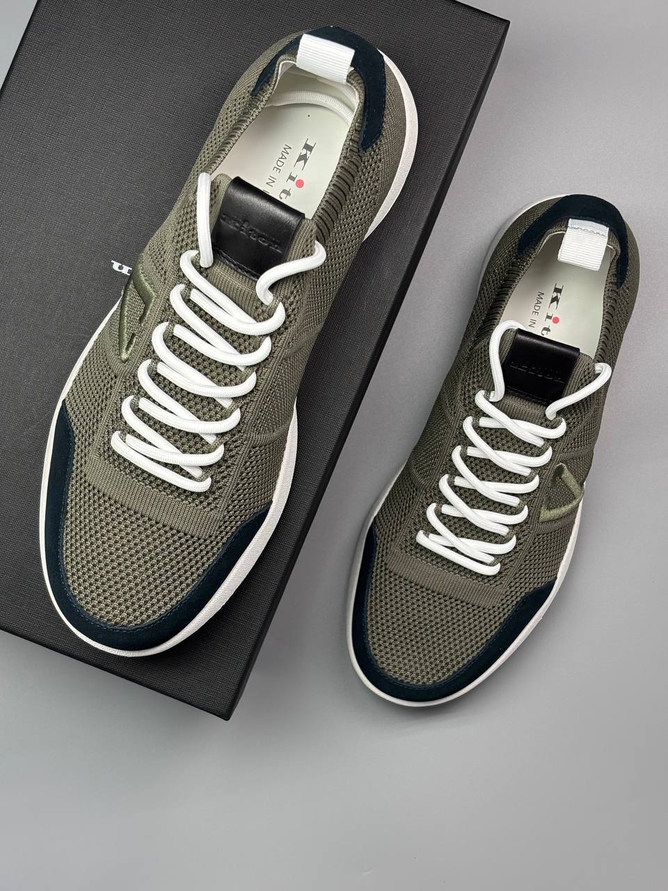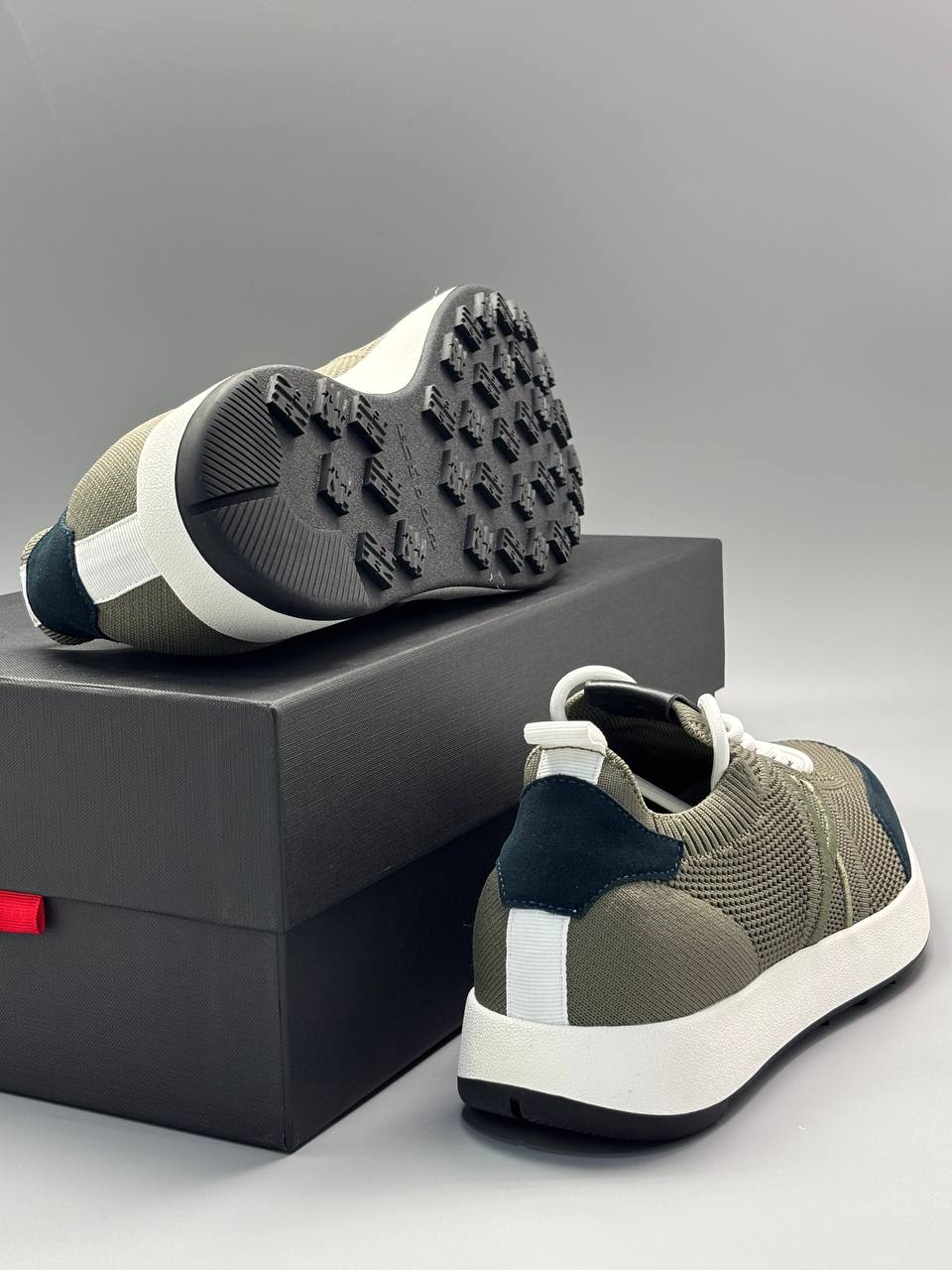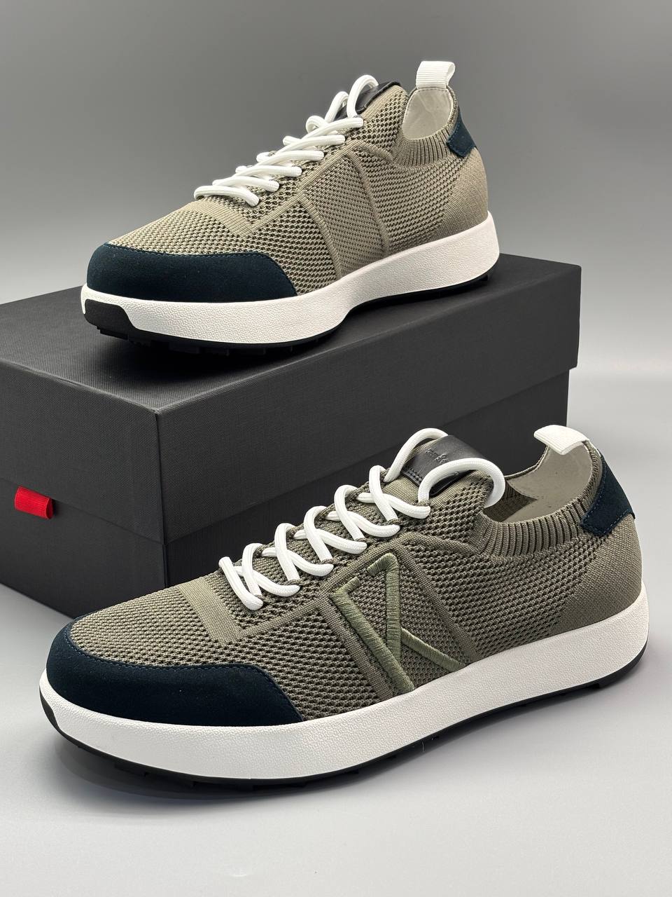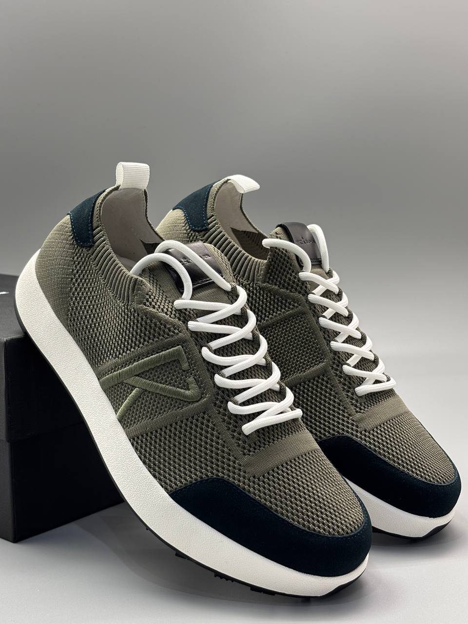 Стильные кроссовки в оливковом цвете с вязаным текстильным верхом. Современный спортивный дизайн дополнен контрастными темно-синими вставками на носке.