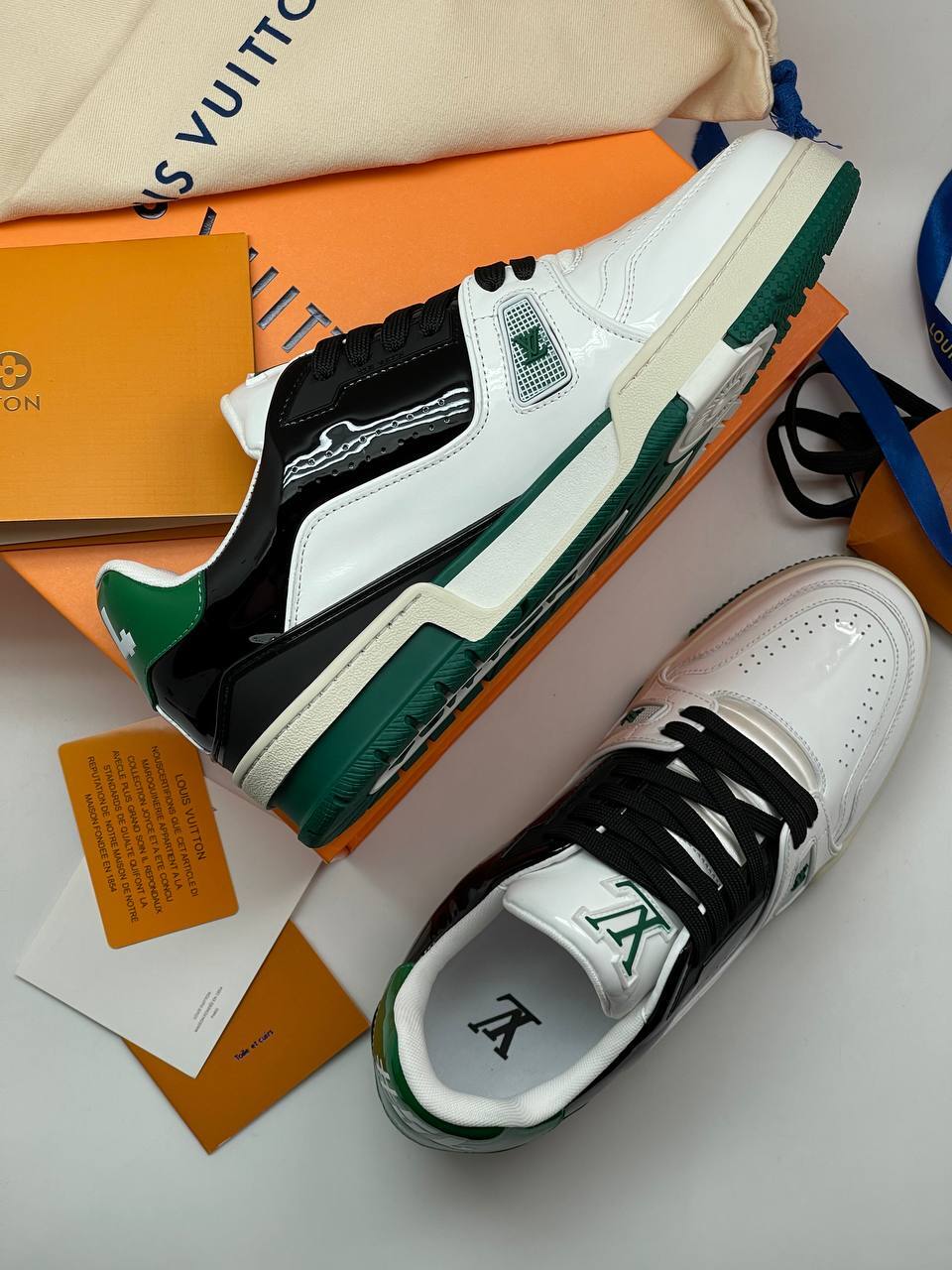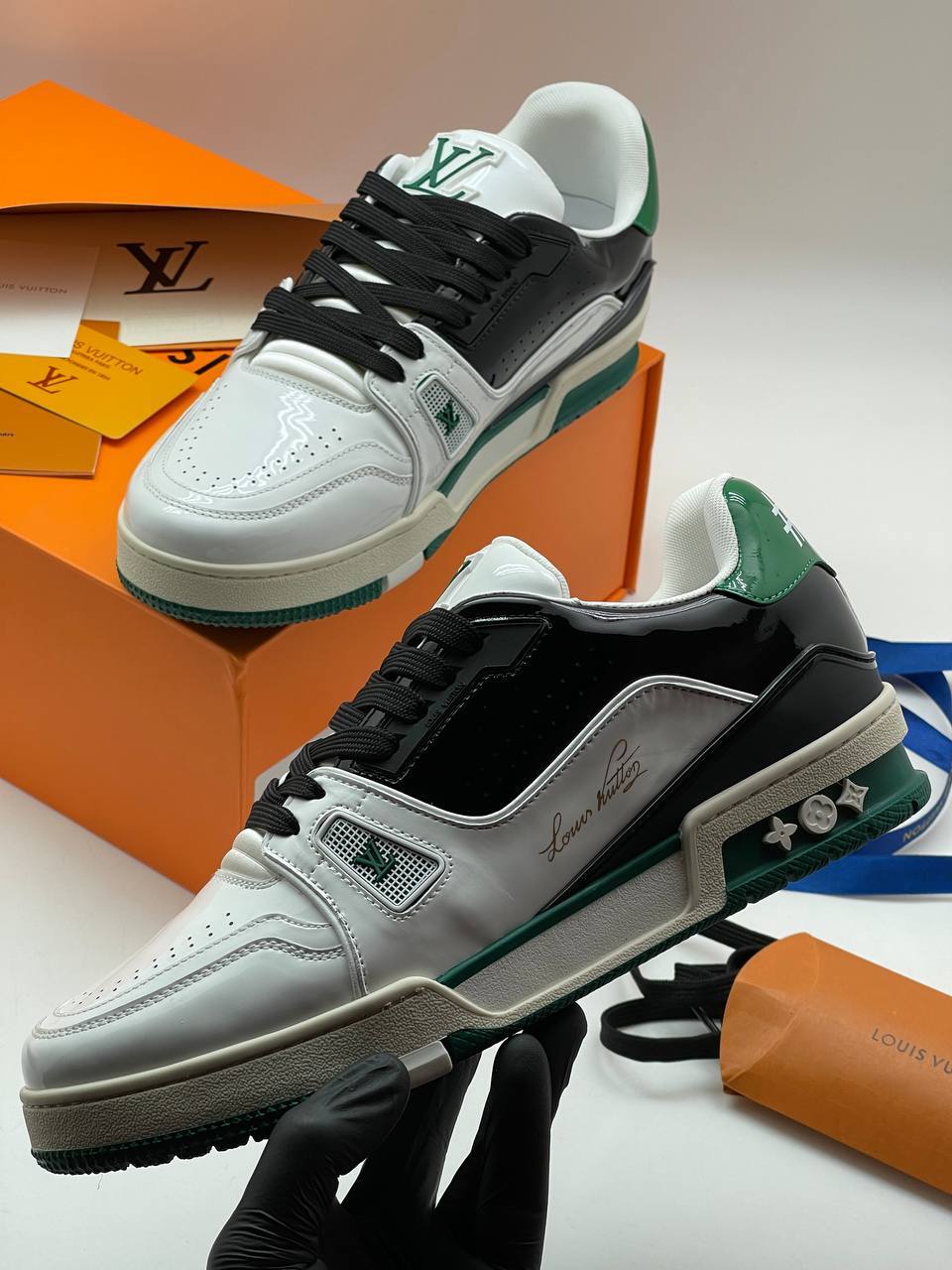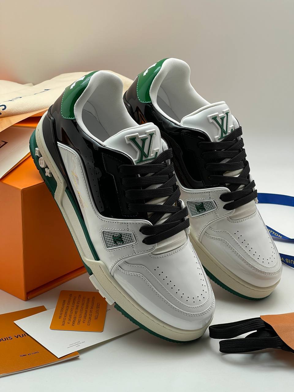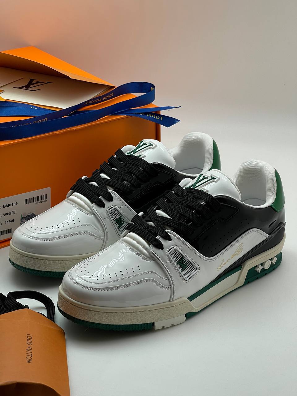 Классические кроссовки из натуральной лаковой кожи с фирменным логотипом и сочетанием белого и черного цветов, воплощающие элегантность и комфорт.