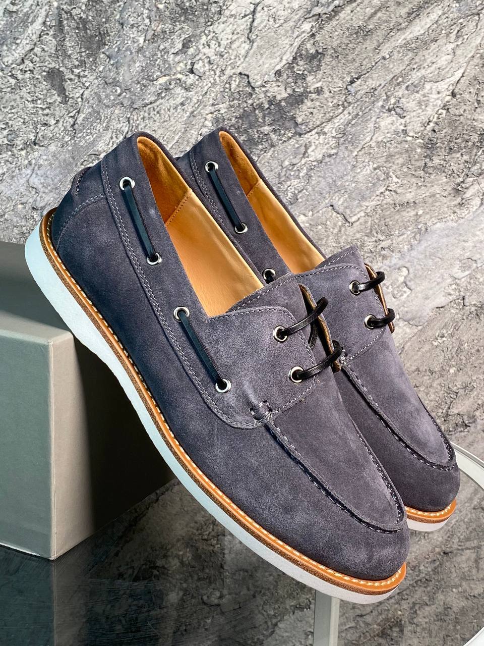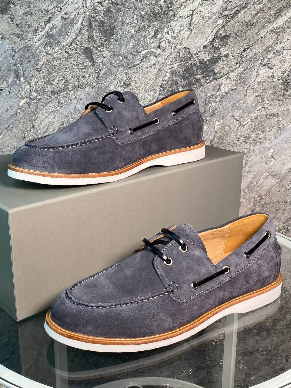 Замшевые топ-сайдеры в сером цвете с контрастной белой подошвой - стильный выбор для повседневной носки.