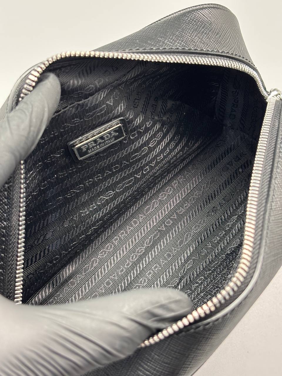 Черный несессер — сдержанная роскошь в каждом штриху: сафьяновая фактура, аккуратный треугольный логотип и серебристая фурнитура создают образ совершенства. Идеален для города и путешествий — компактно, но ёмко.