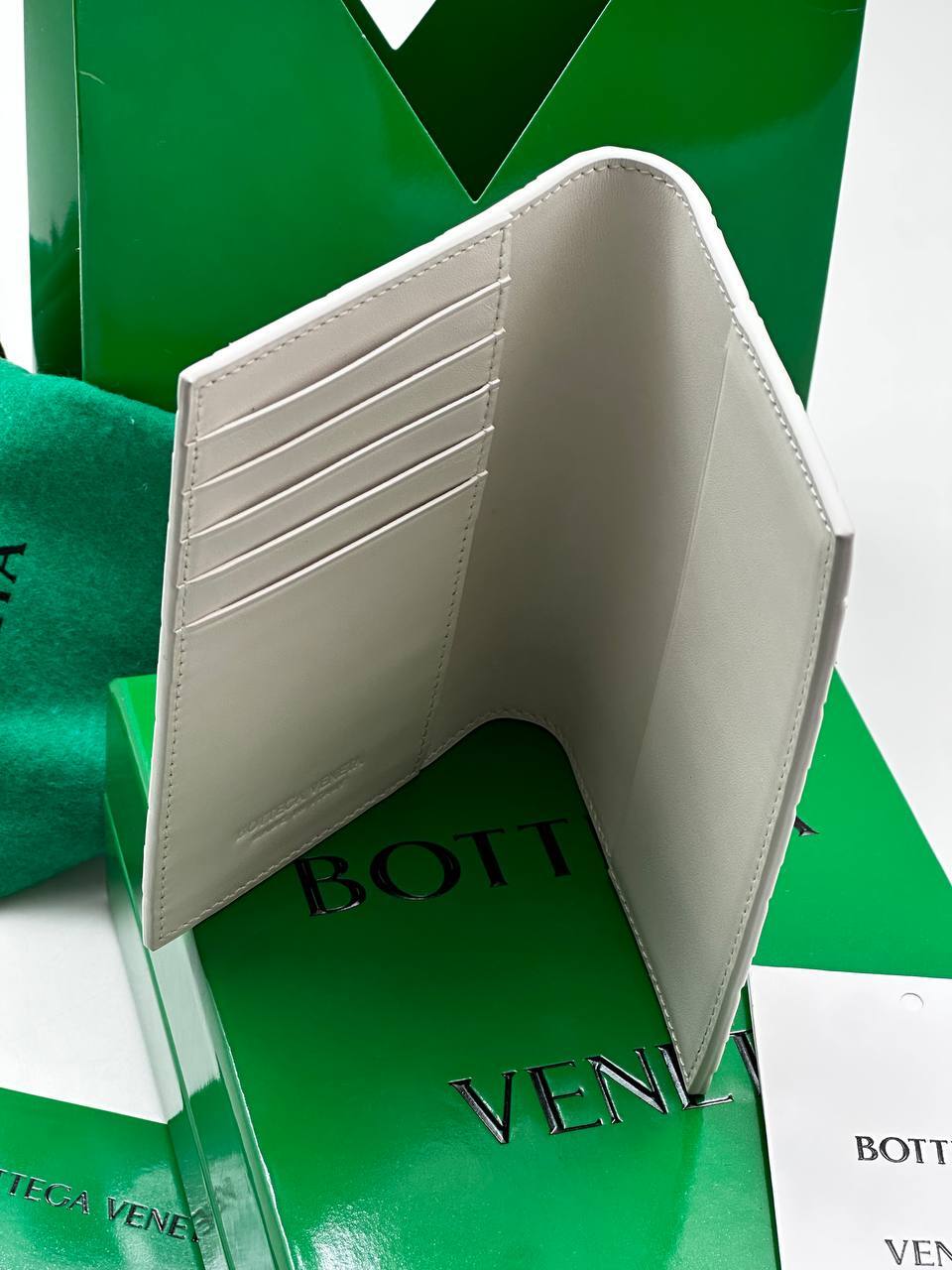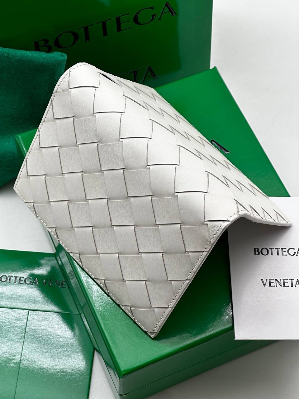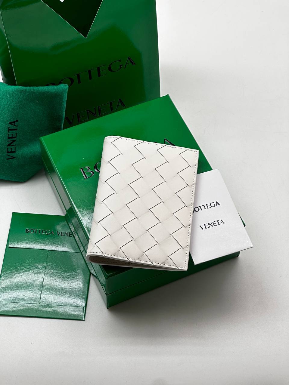 Кожаная обложка для паспорта — мягкая телячья кожа, минималистичный стиль, фирменное плетение Intrecciato в сдержанном белом дизайне.