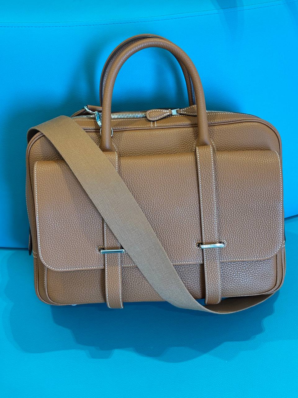 Кожаная сумка-портфель в классическом стиле с фактурой под зернистую кожу. Коричневый цвет, металлическая фурнитура, двойные ремешки с пряжками. Идеальна для делового образа.