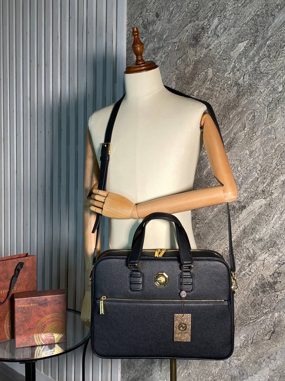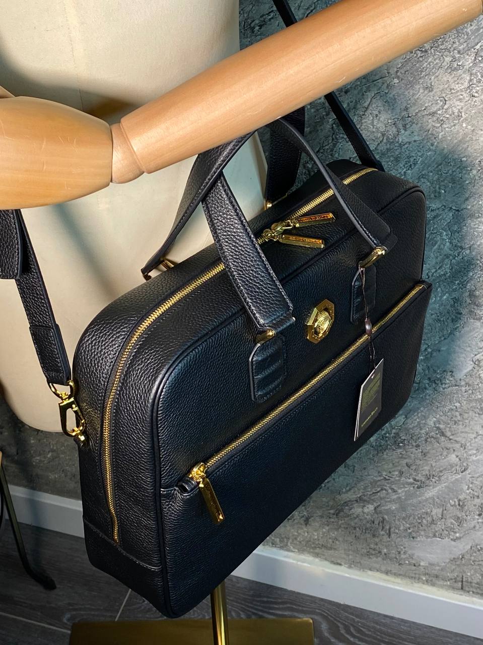 Строгий черный портфель из зернистой кожи с двумя удобными ручками и длинным съемным ремнем.