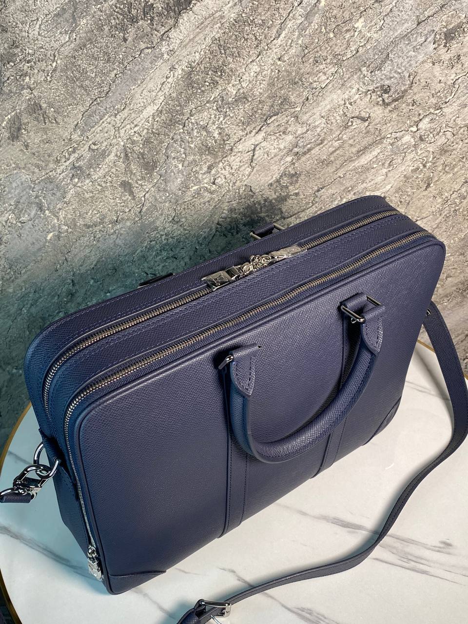 Деловой портфель из сафьяновой кожи синего цвета с элегантным дизайном от известного бренда, идеален для офиса и командировок.