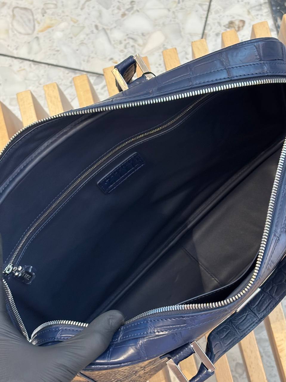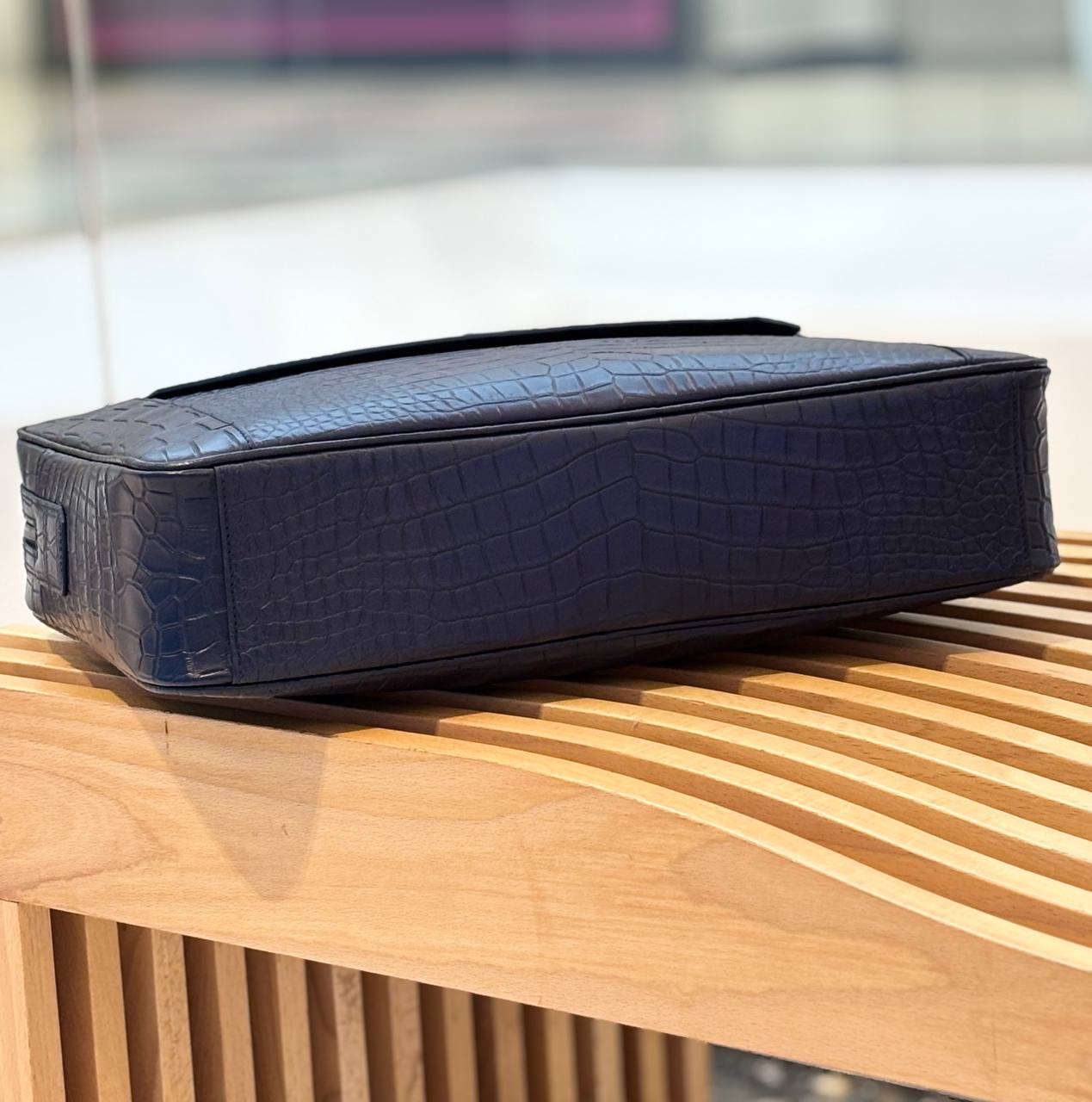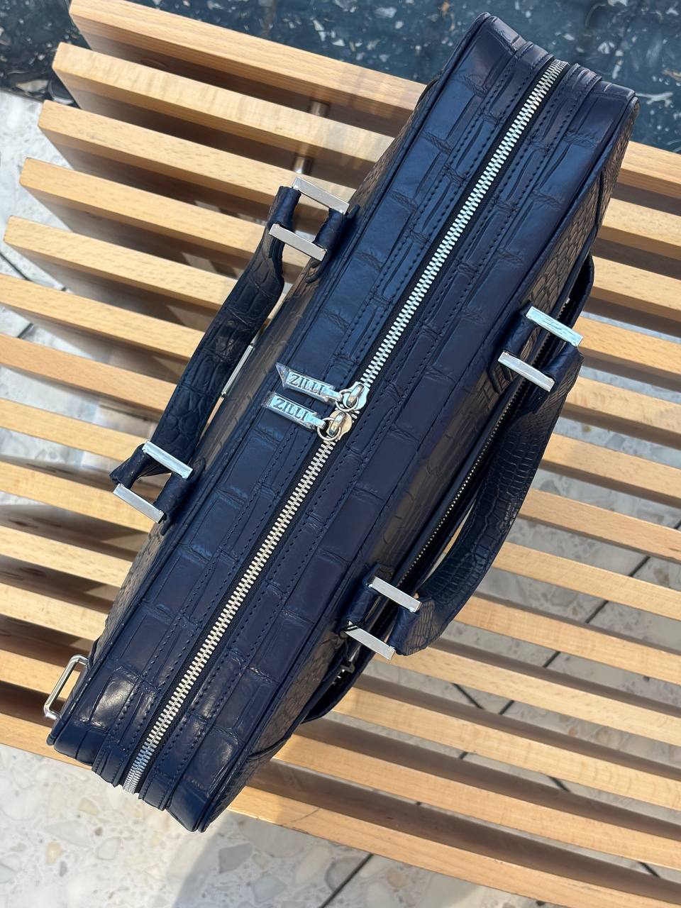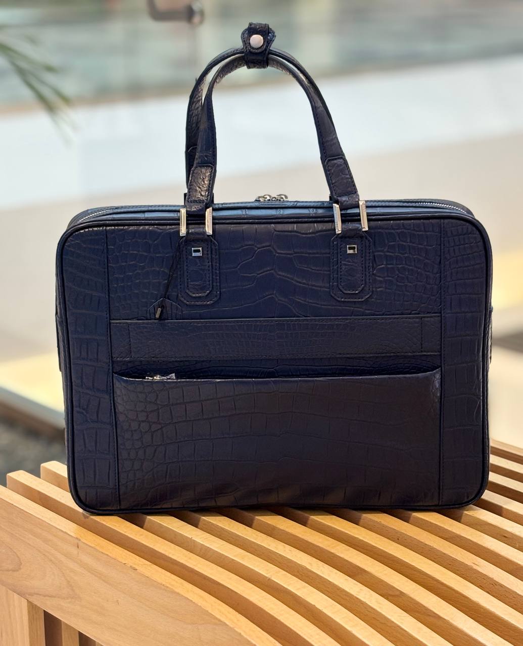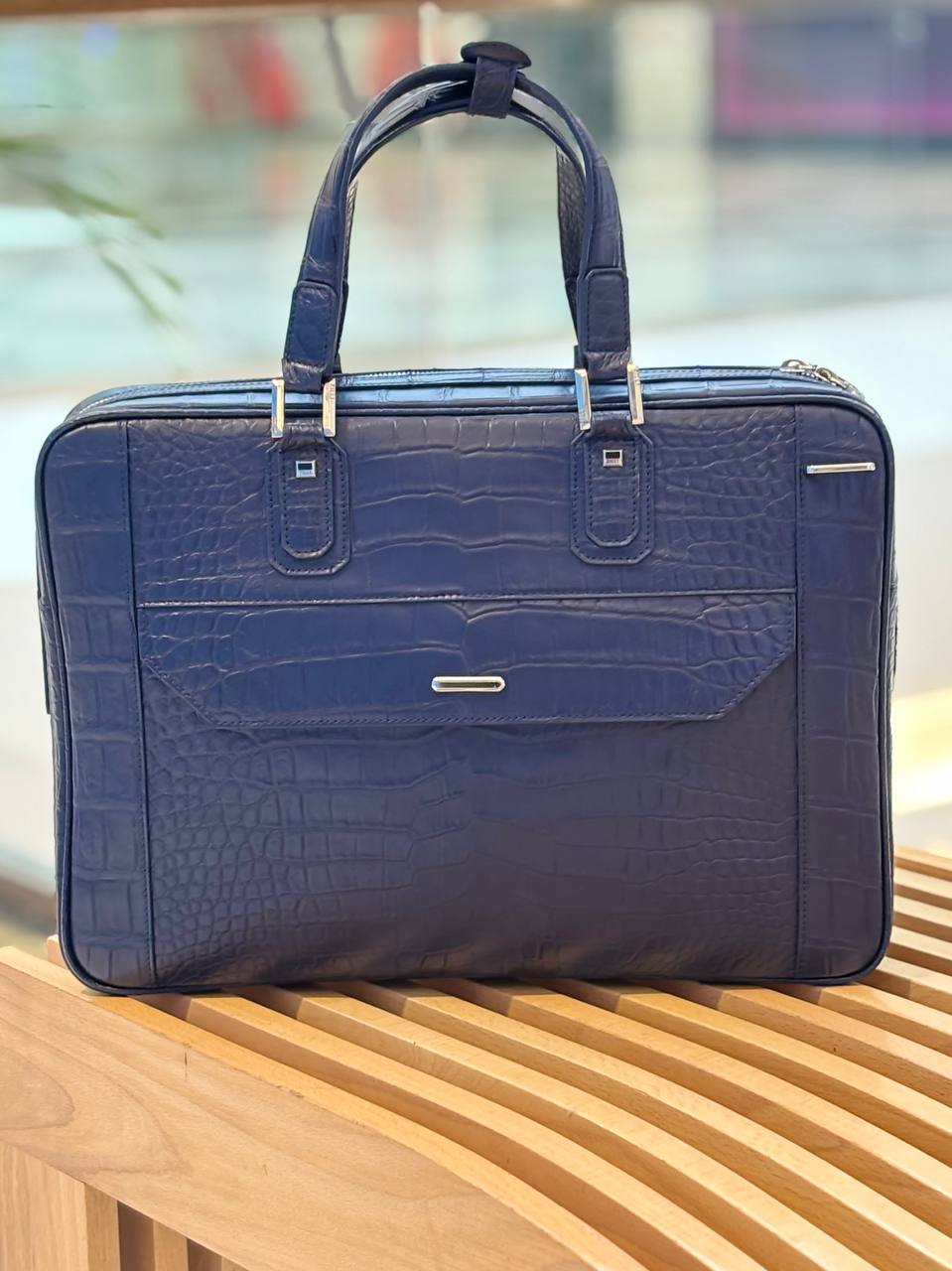 Сдержанная роскошь для делового гардероба: глубокий синий крокодиловый рельеф, чистые линии и прочные ручки — всё, чтобы ваши документы и ноутбук шли наравне с вашим статусом.