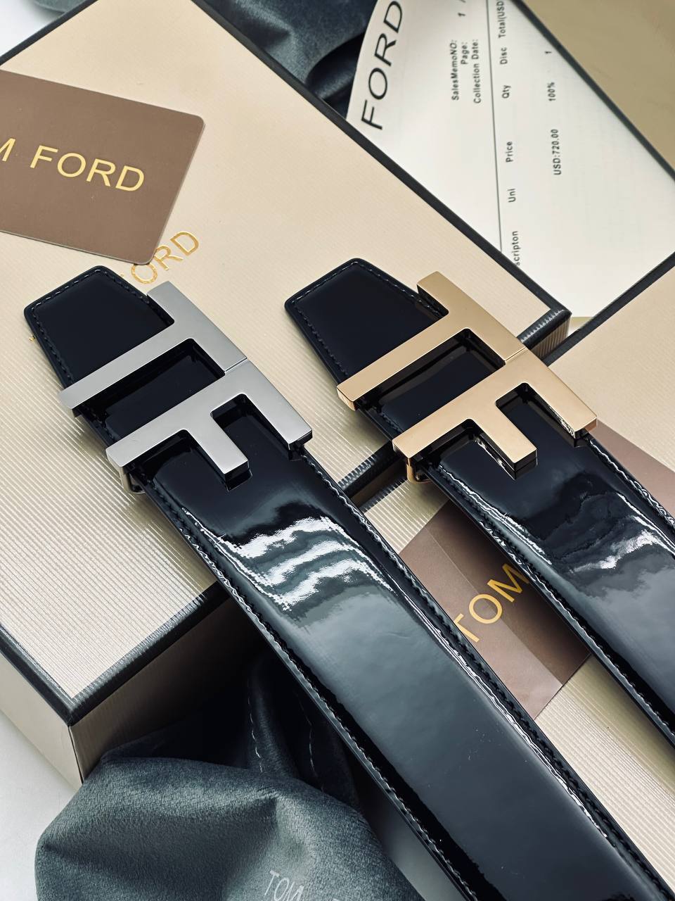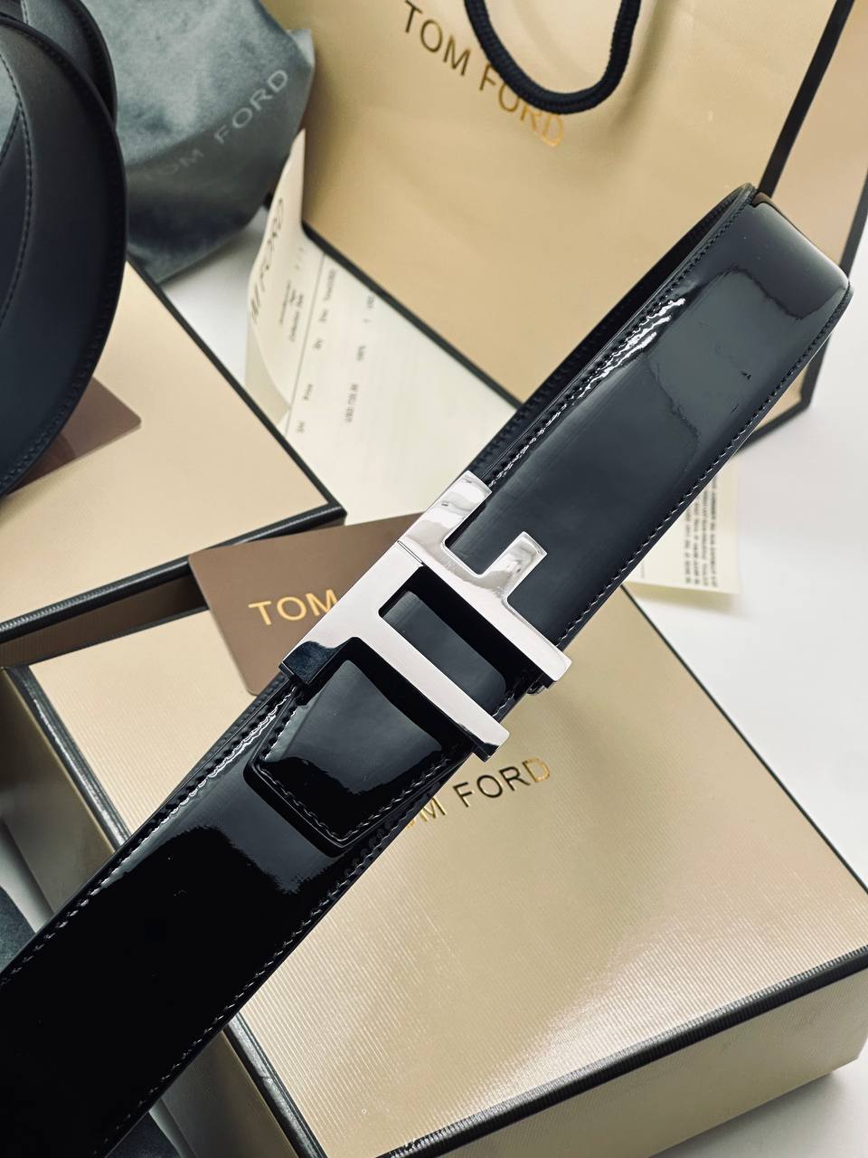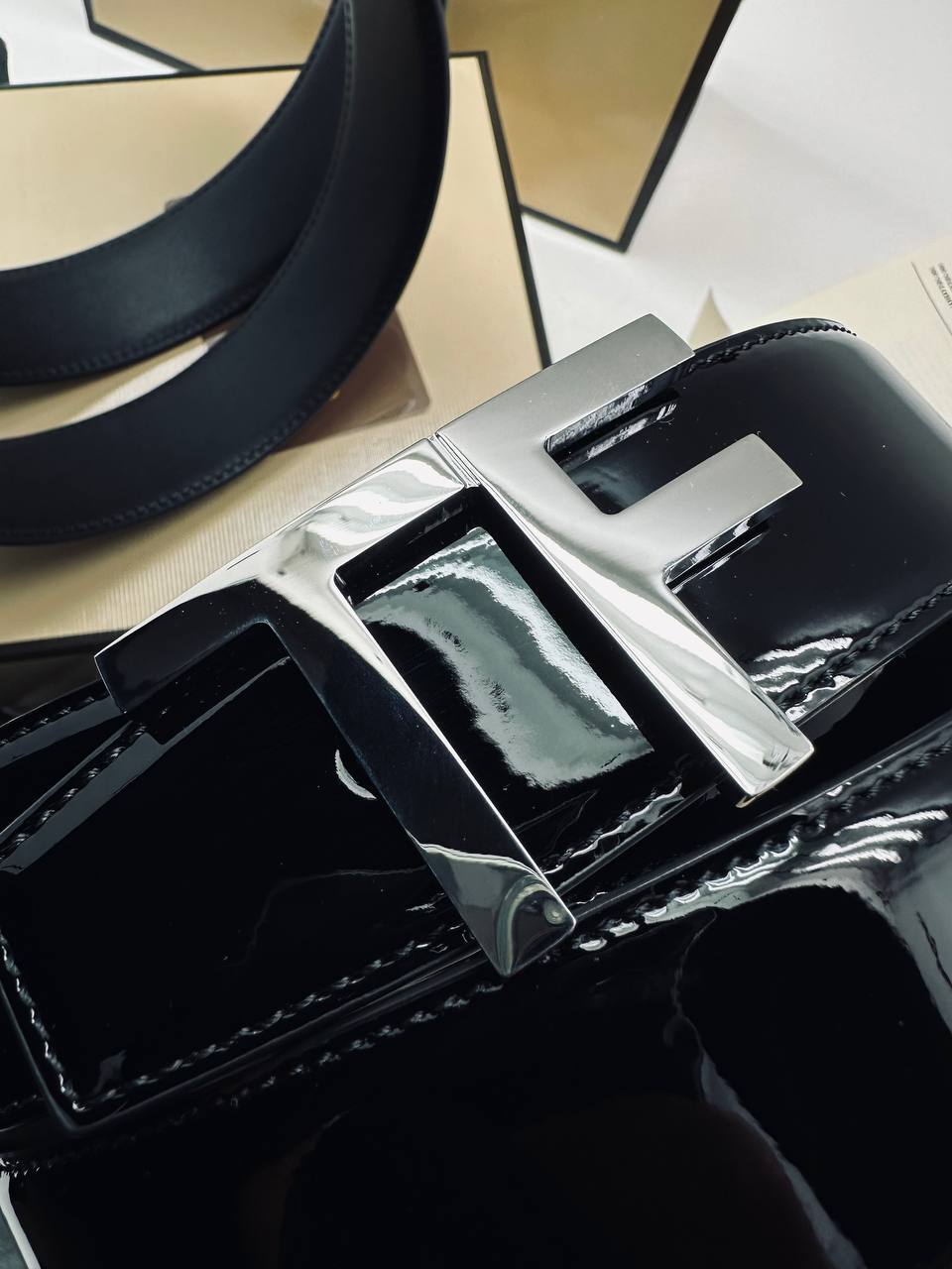 Лаконичный дизайн и благородный оттенок: фирменный ремень из лакированной кожи с характерной пряжкой.