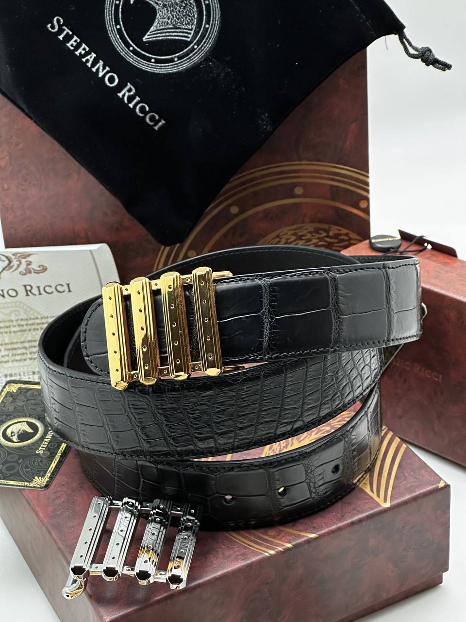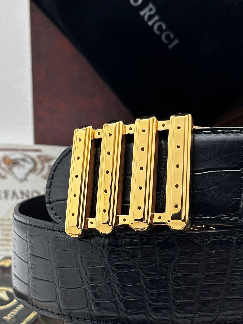 Стильный черный ремень из натуральной кожи с фактурной поверхностью, украшенный массивной золотой пряжкой - настоящая находка для ценителей классики с изюминкой.