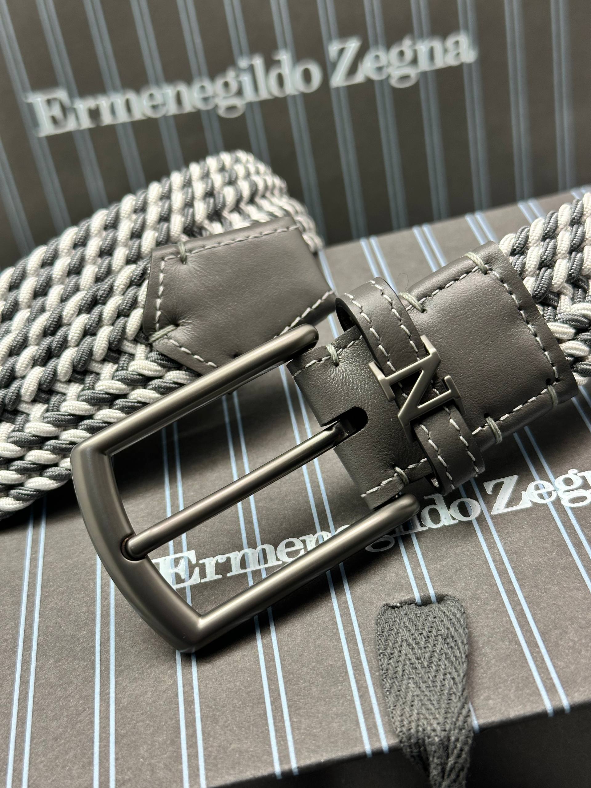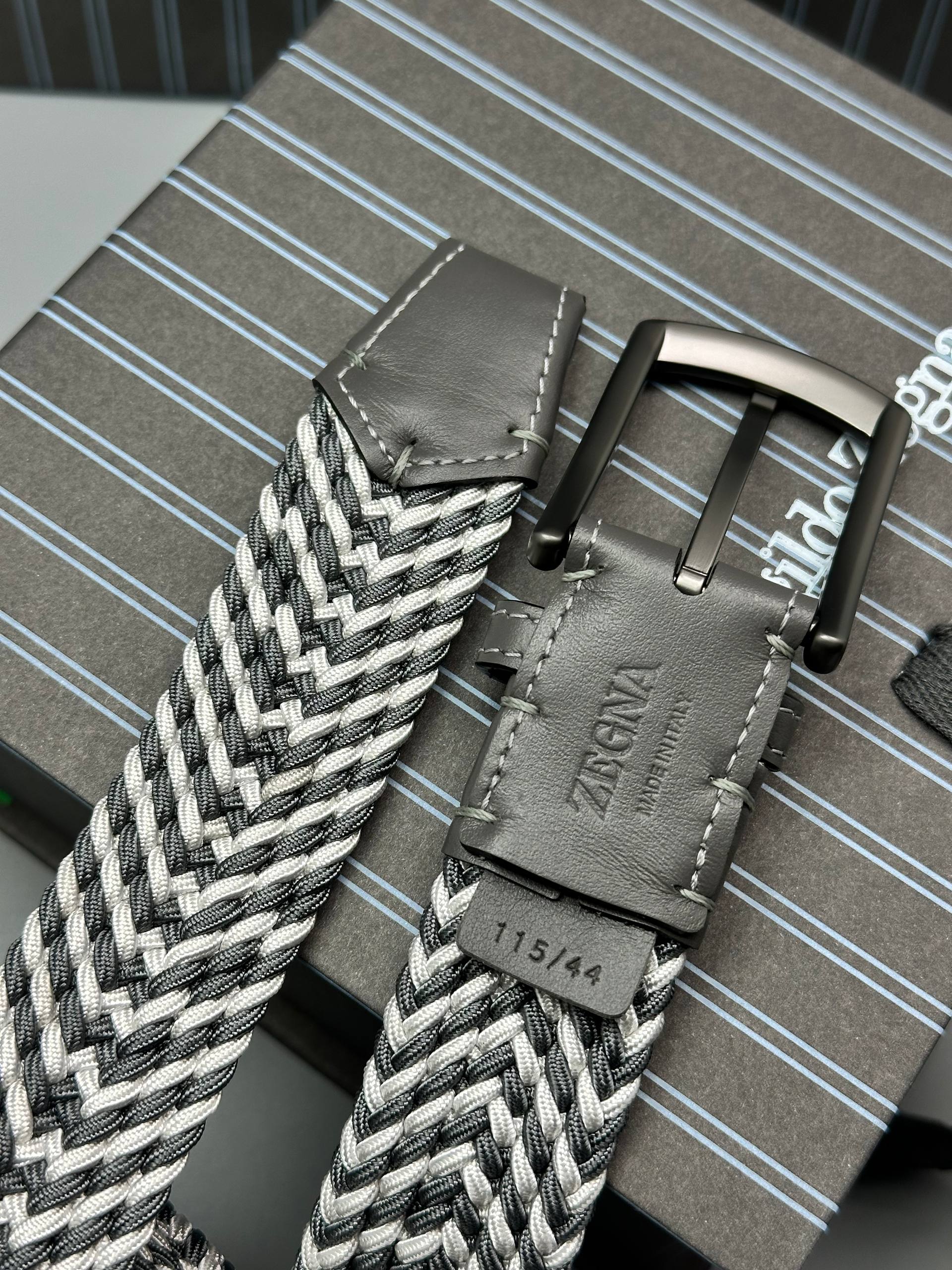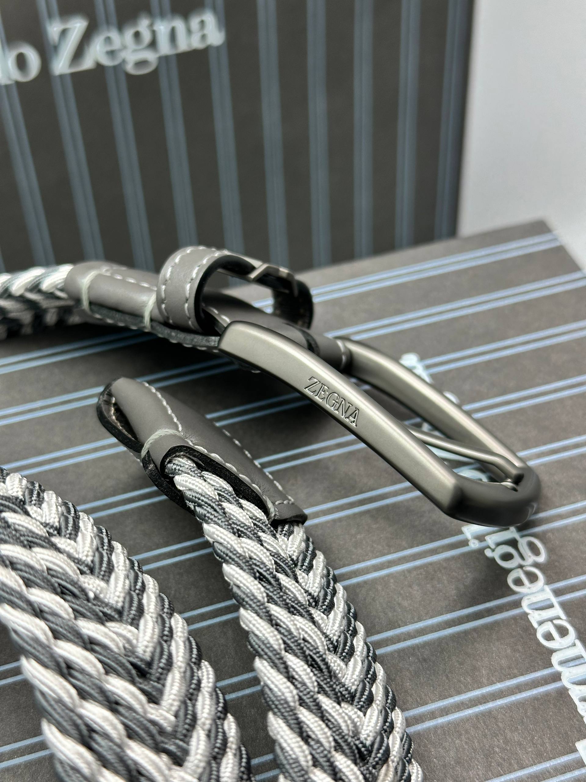 Плетёный ремень из текстиля с кожаной вставкой, в современном стиле.