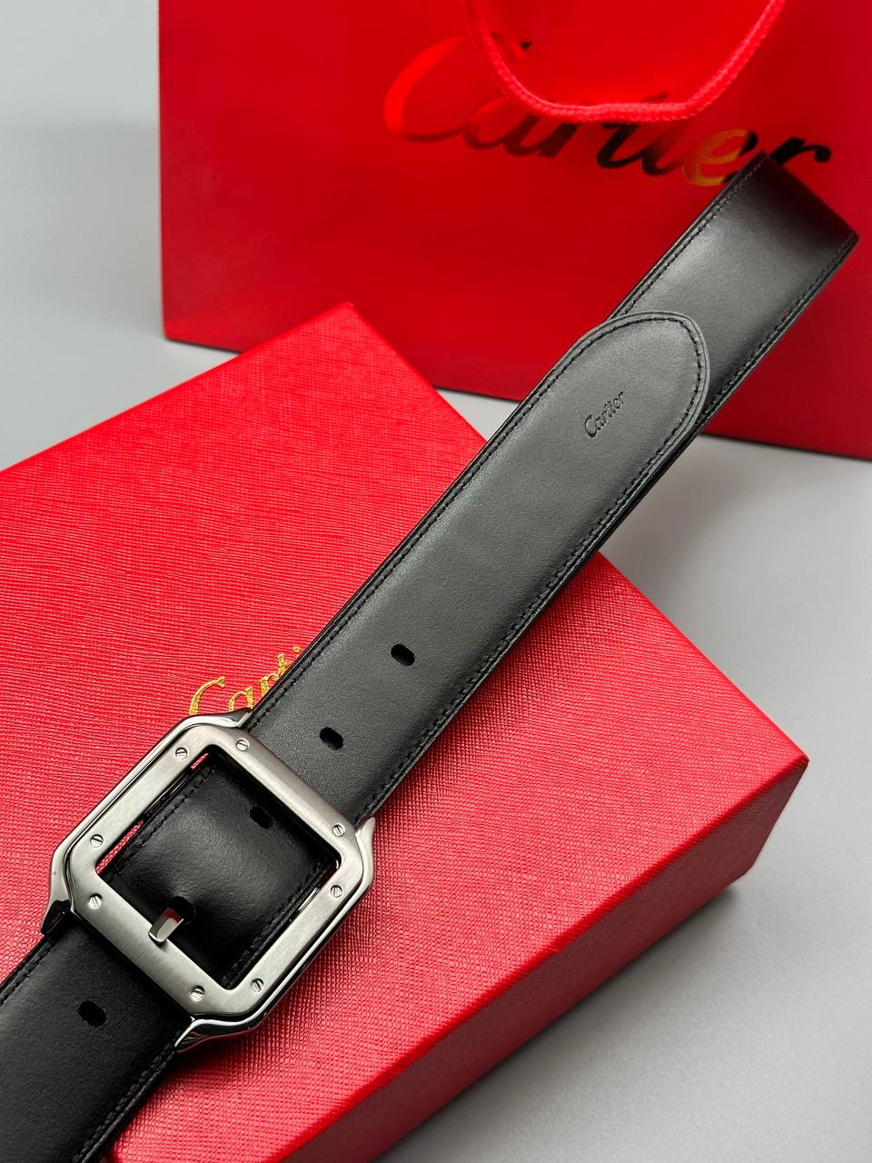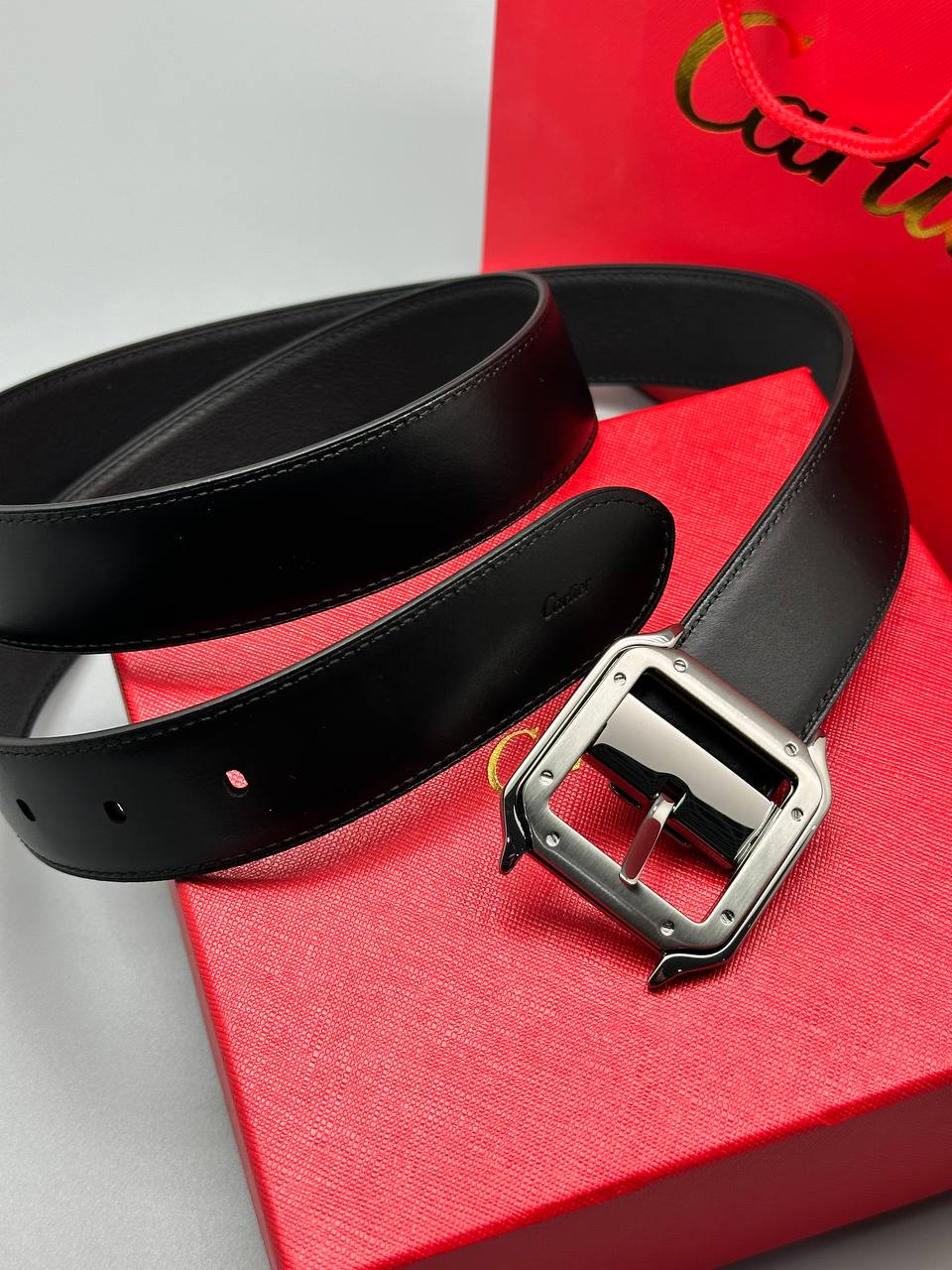 Кожаный ремень в классическом черном цвете. Элегантная квадратная пряжка из полированного металла подчеркивает премиальный статус аксессуара.