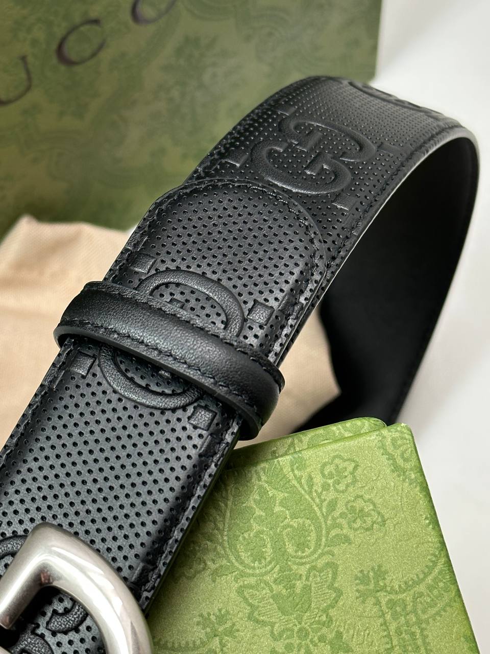 Черный ремень из натуральной кожи с текстурированным дизайном и серебристой пряжкой в виде переплетенных букв G - узнаваемый символ итальянского бренда.