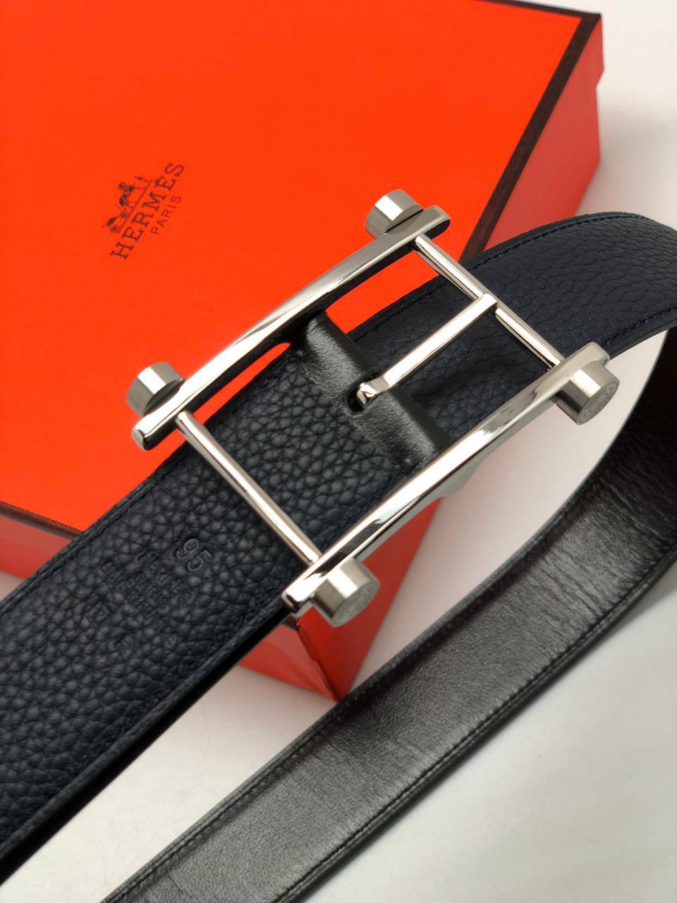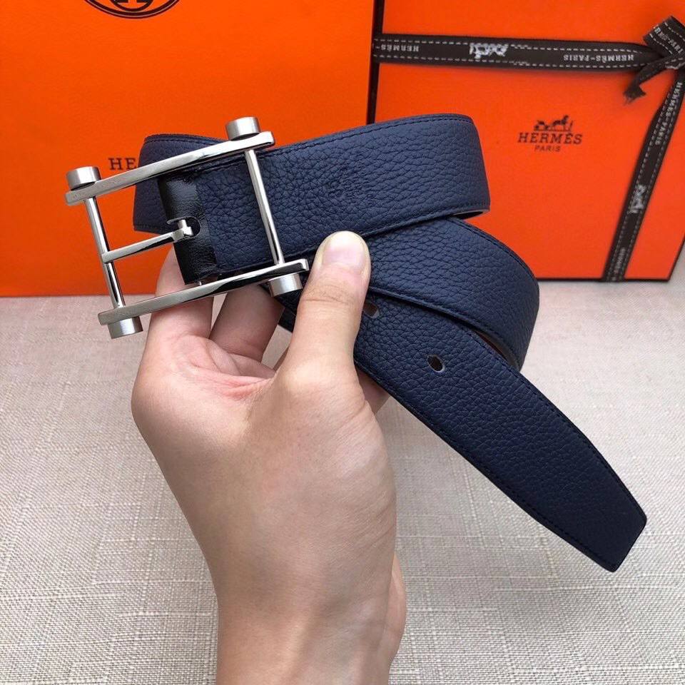 Фирменный классический ремень тёмно-синего цвета из прочной текстурированной кожи с узнаваемой металлической пряжкой.
