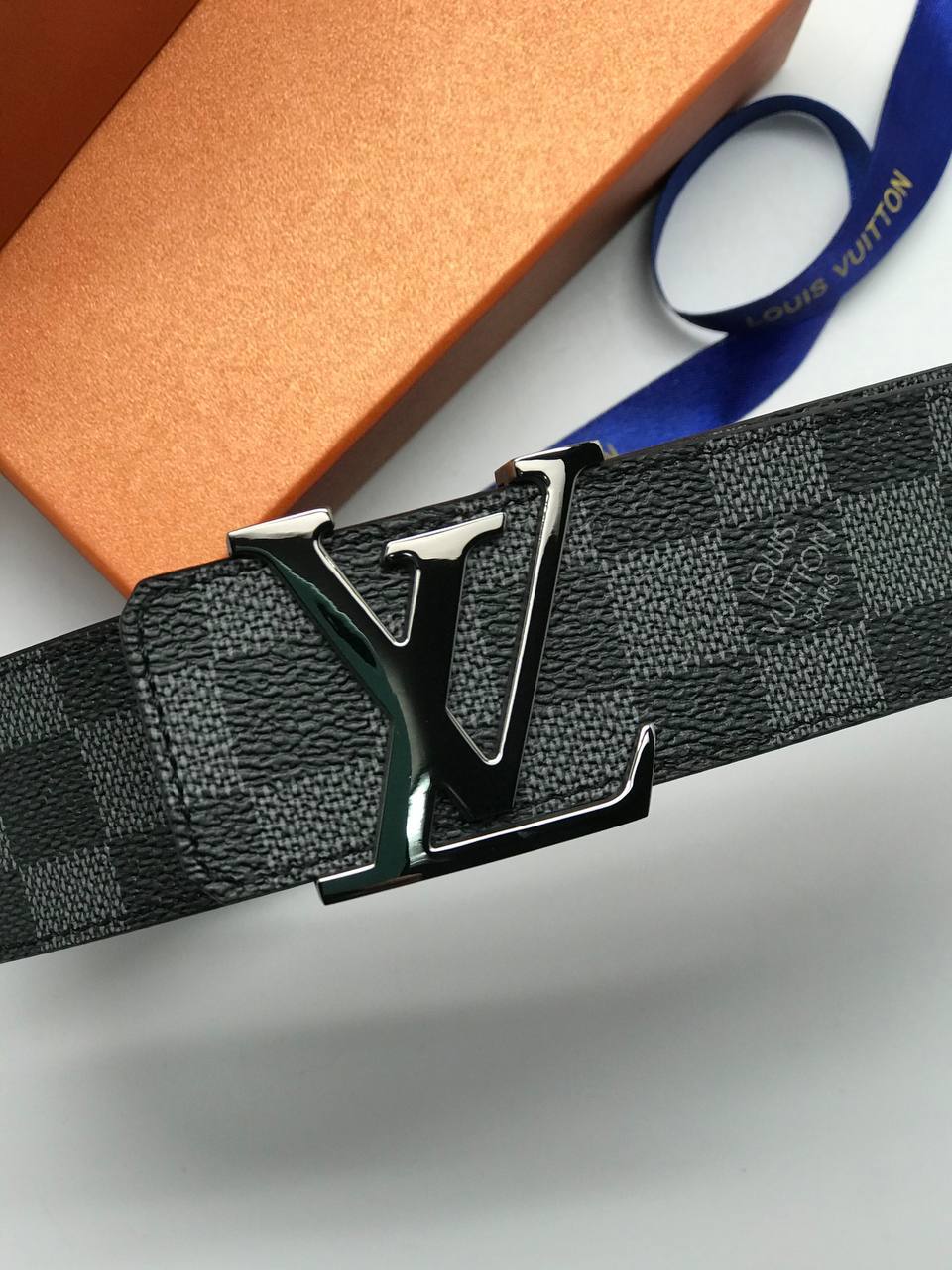 Стильный ремень с узнаваемым монограммным узором и серебристой пряжкой в виде логотипа LV.