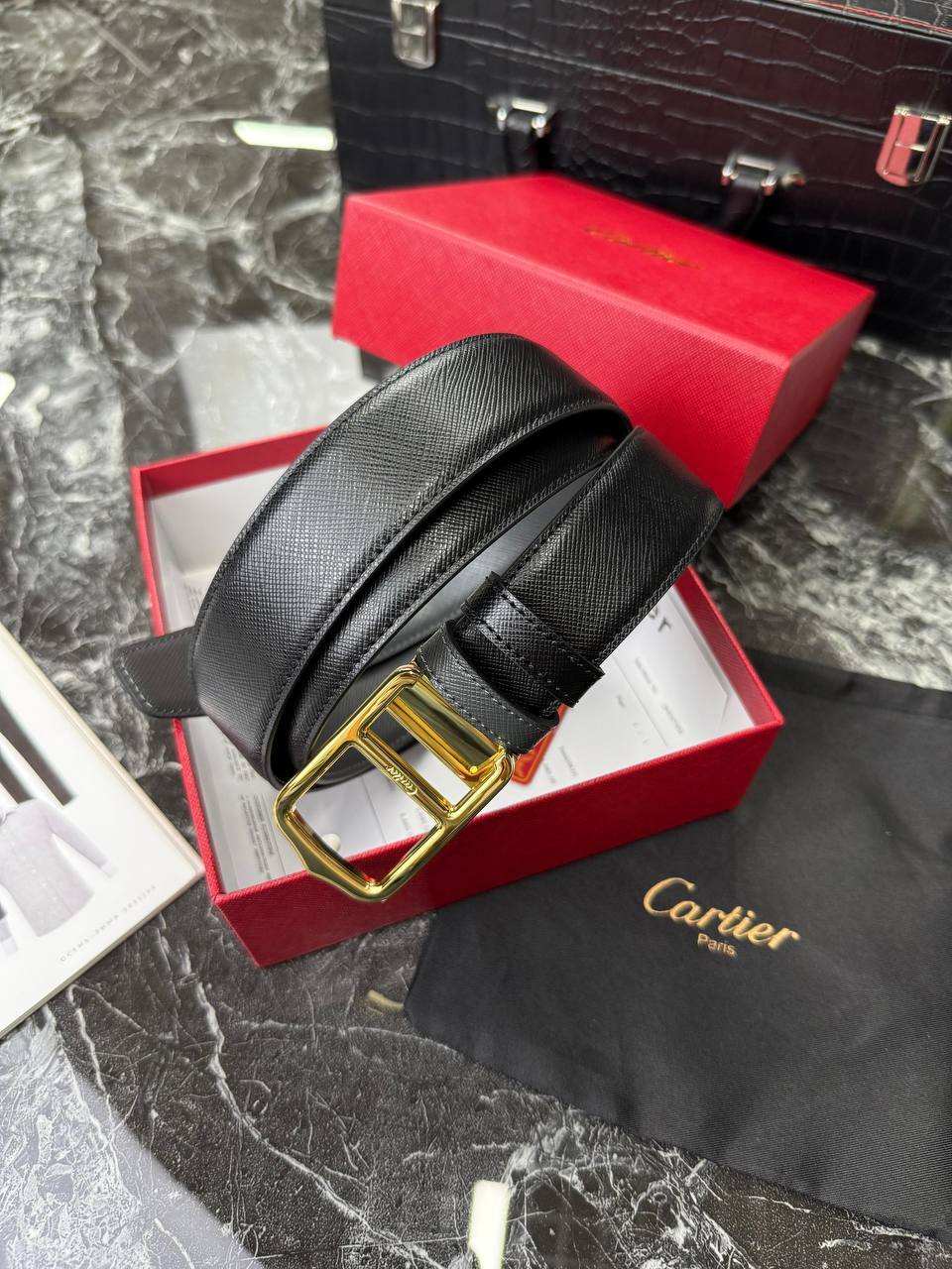 Ремень от знаменитого бренда Cartier станет идеальным дополнением к вашему стилю! Изготовлен из высококачественной кожи, этот ремень сочетает в себе элегантность и долговечность. Вы будете выглядеть безупречно каждый день благодаря этому модному аксессуару от Cartier.