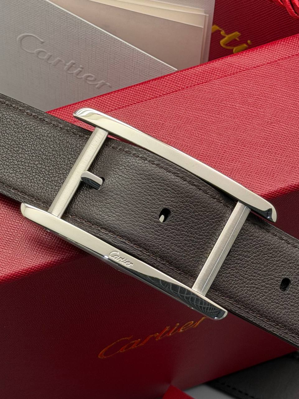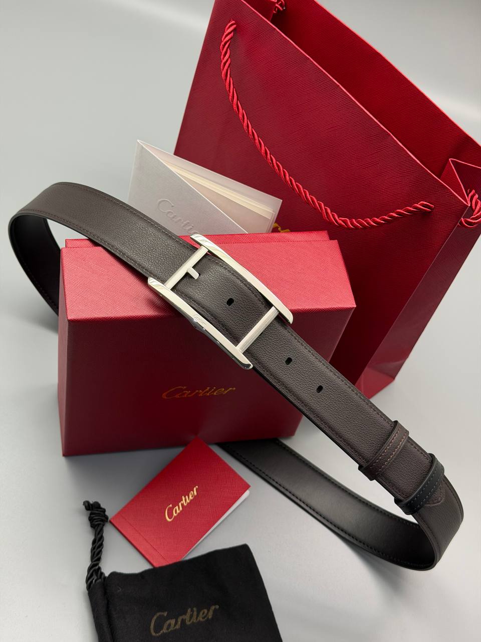 Двухсторонний кожаный ремень — черная сдержанность и тёплый коричневый оттенок в одном аксессуаре. Полированная серебристая пряжка и безупречные швы делают образ завершённым и аристократичным.