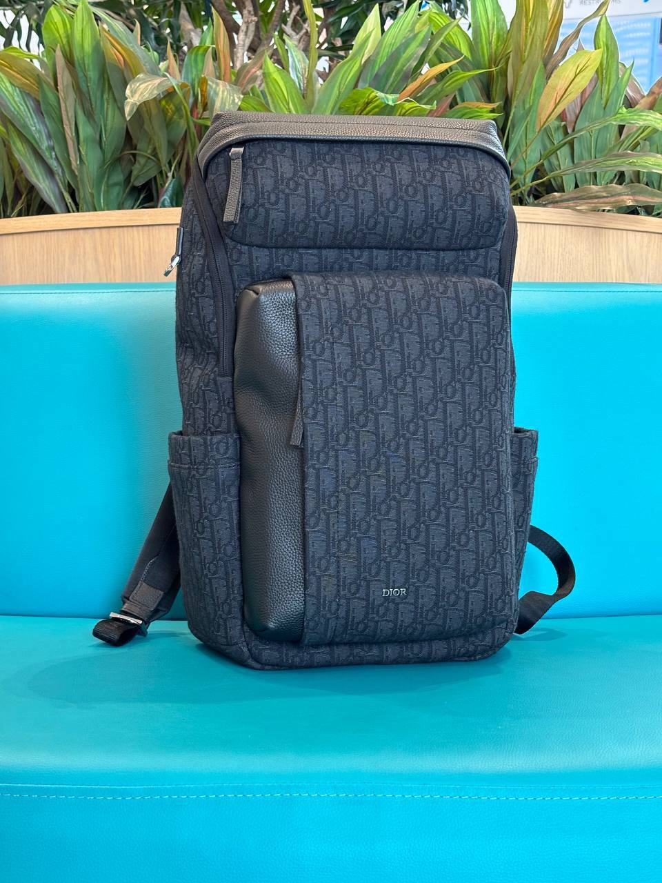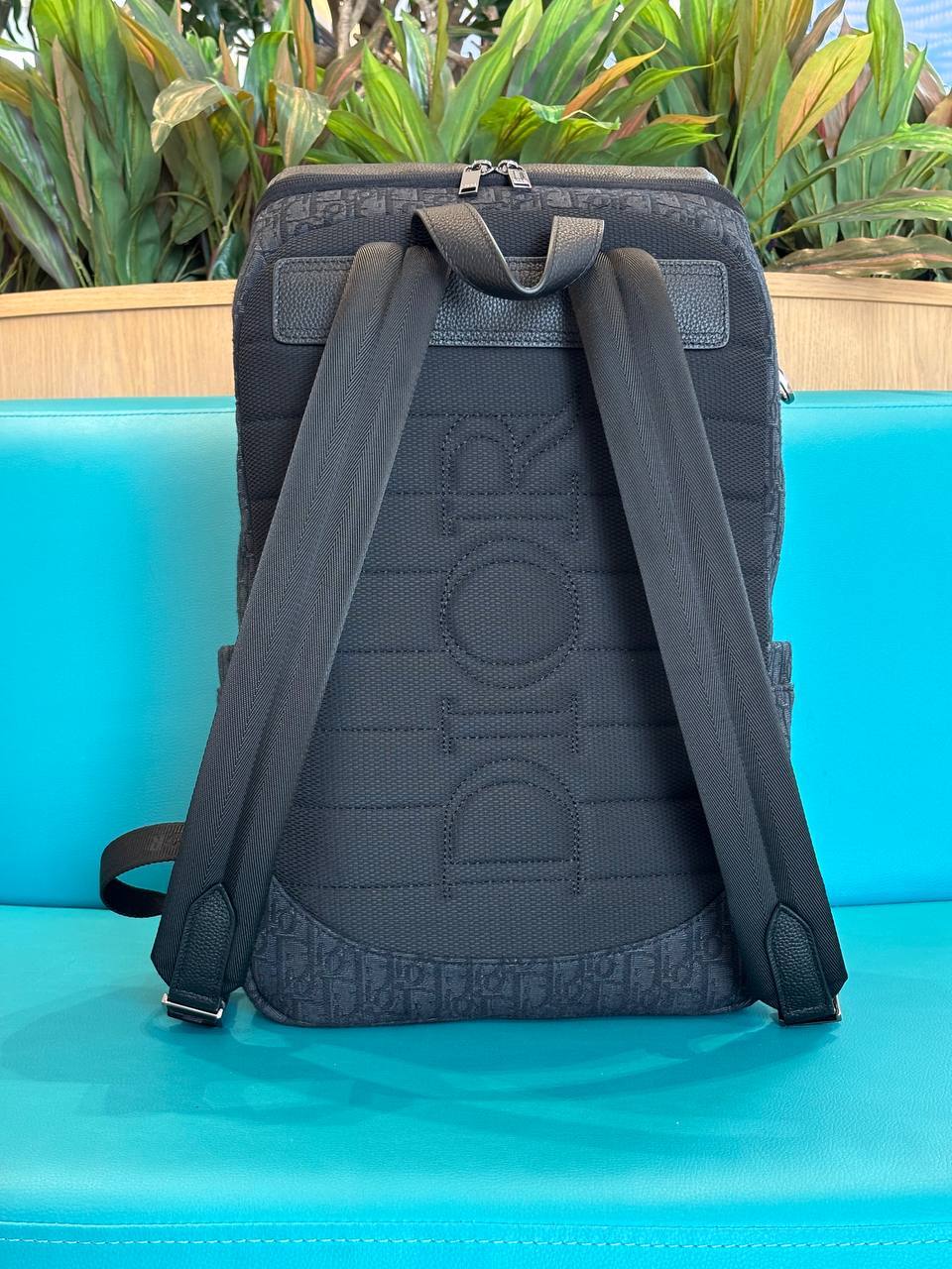 Рюкзак из фирменного жаккарда с монограммой в темно-сером цвете. Современный дизайн сочетает текстильную основу с кожаными вставками, создавая люксовый городской аксессуар с функциональными отделениями.