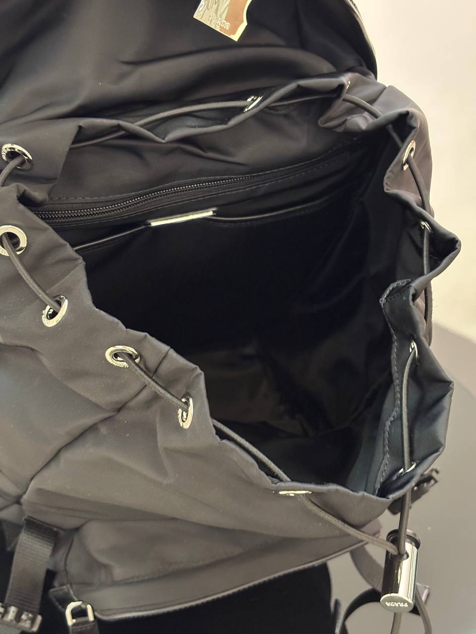 Практичный и стильный нейлоновый рюкзак в черном цвете с контрастной кожаной отделкой и лаконичным треугольным логотипом бренда.
