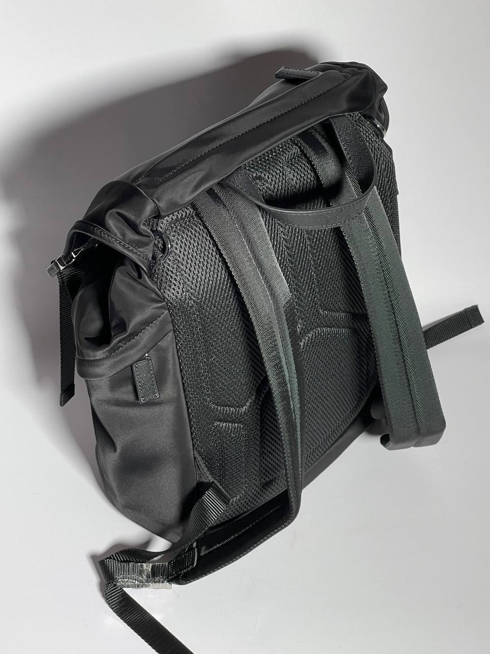 Рюкзак Prada технического дизайна изготовлен из Re-Nylon, инновационной технической ткани. Аксессуар украшен деталями из сафьяновой кожи.