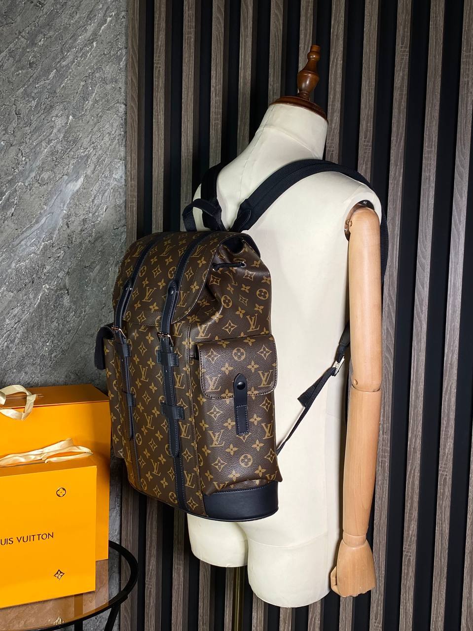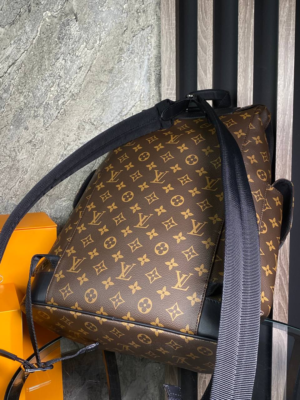 Премиальный рюкзак из коричневой монограммной канвы с тёмными кожаными ремнями и деталями в стиле casual.