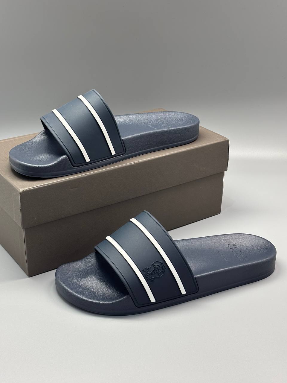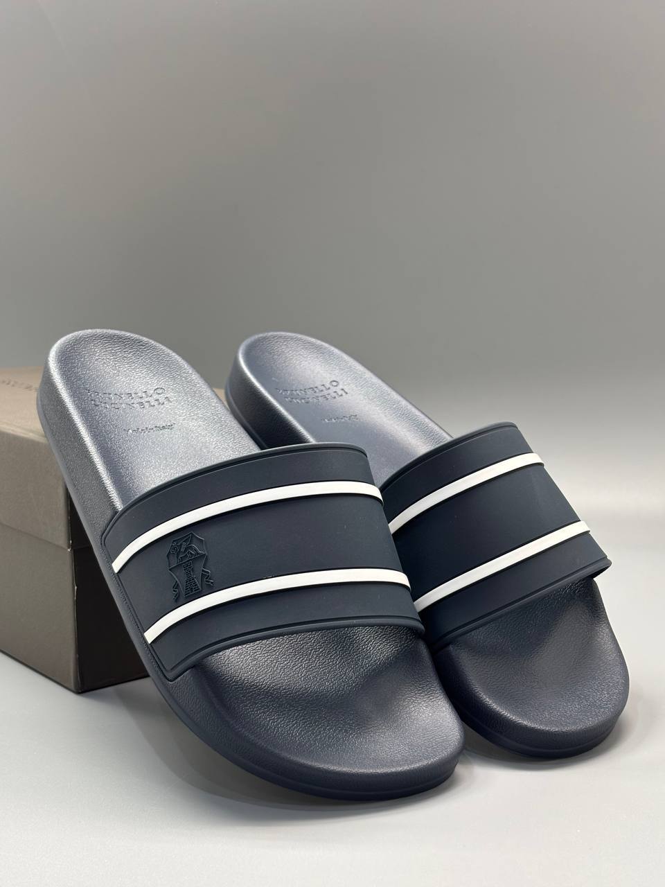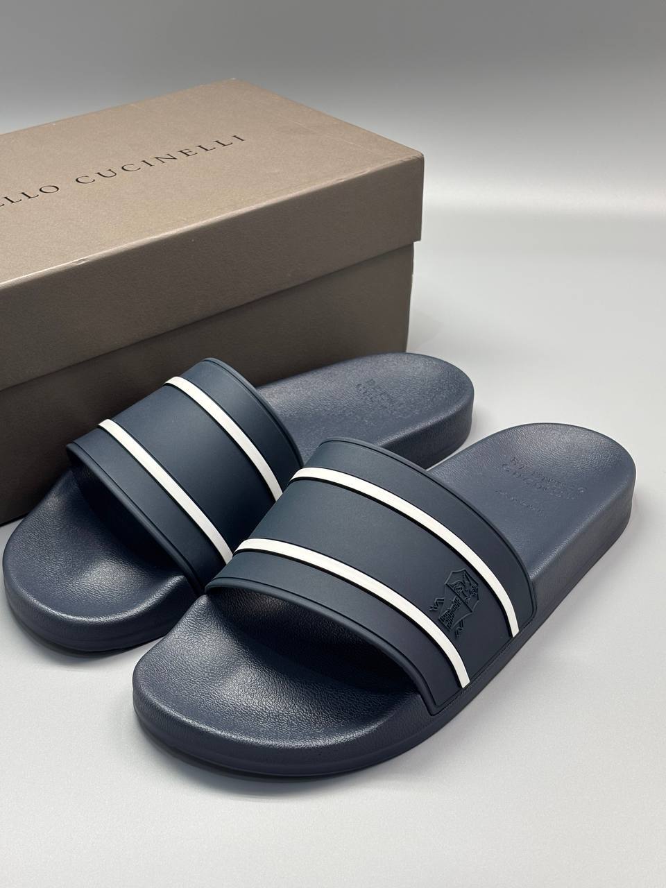 Классические мужские слайдеры в темно-синем цвете с контрастными белыми полосками. Выполнены из качественной резины с рельефным логотипом бренда.