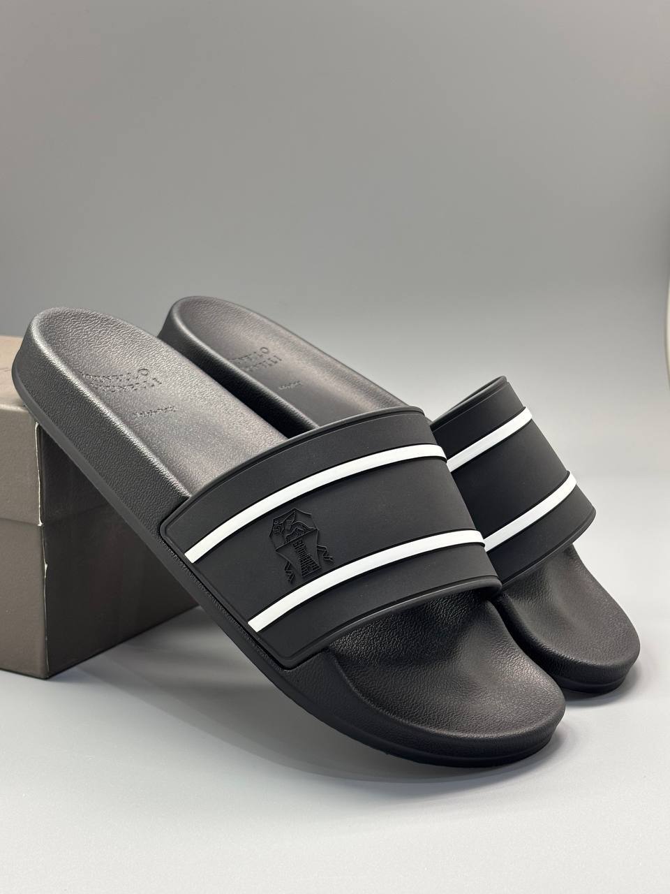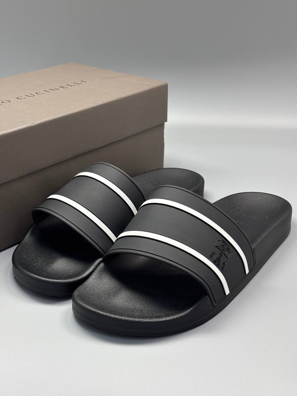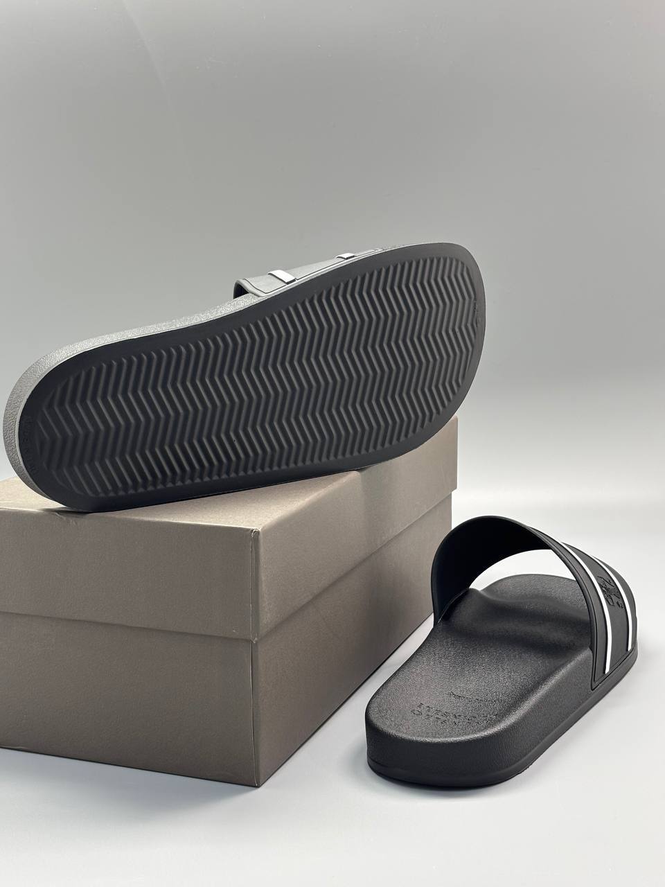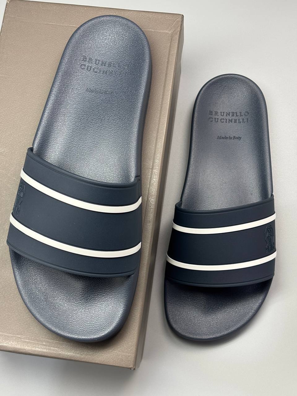 Классические мужские слайдеры в темно-синем цвете с контрастными белыми полосками. Выполнены из качественной резины с рельефным логотипом бренда.