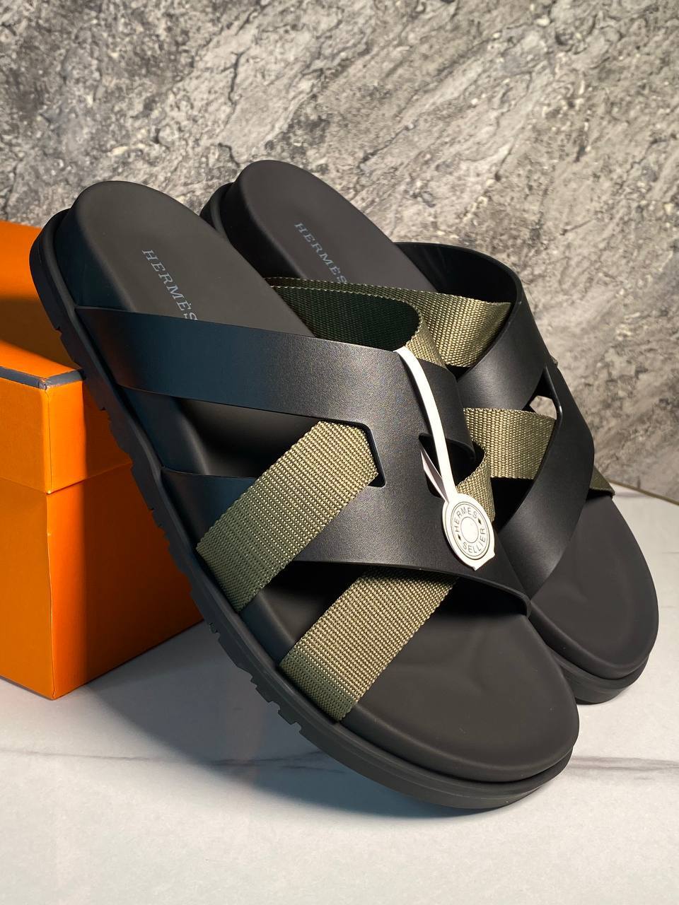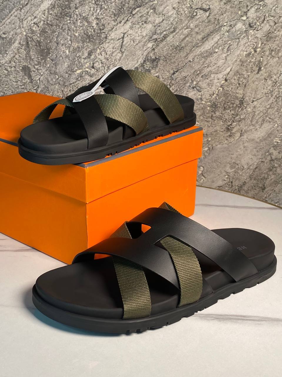 Мужские шлёпанцы из кожи и текстиля в оливковых тонах, сочетающие удобство и современный дизайн.